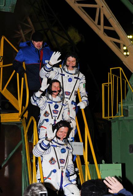 (15 Dicembre 2010) Dmitry Kondratyev (in basso), Cady Coleman e Paolo Nespoli salutano le persone presenti a Baikonur poco prima di salire aulla loro Soyuz. (C) NASA/Carla Cioffi