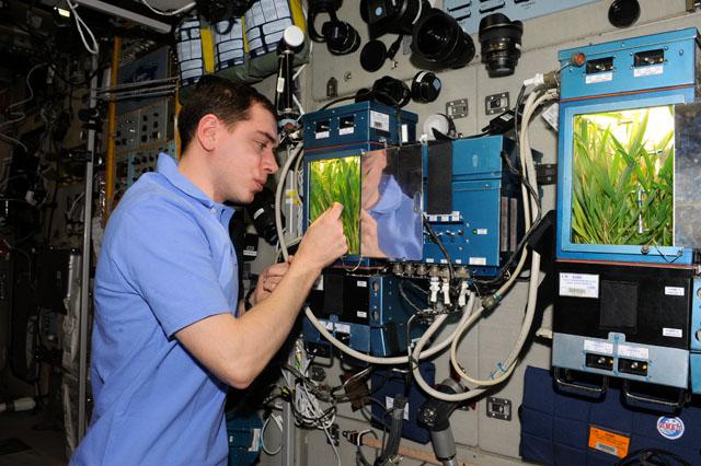 (22 Settembre 2011) Sergei Volkov controlla i progressi dell’esperimento sulle piante BIO-5 Rasteniya e della serra LADA-01 nel modulo Zvezda.