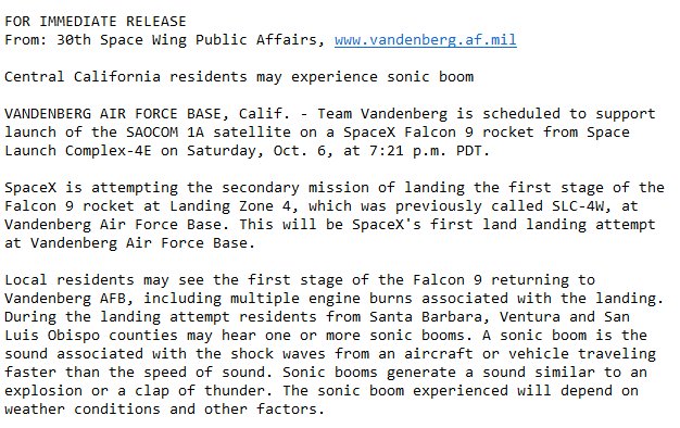 Il 30mo Stormo, quello operativo a Vandenberg, ha emesso un avviso per la popolazione relativo ai boom sonici che saranno causati dal primo atterraggio di Falcon 9 su una Landing Zone della costa occidentale.