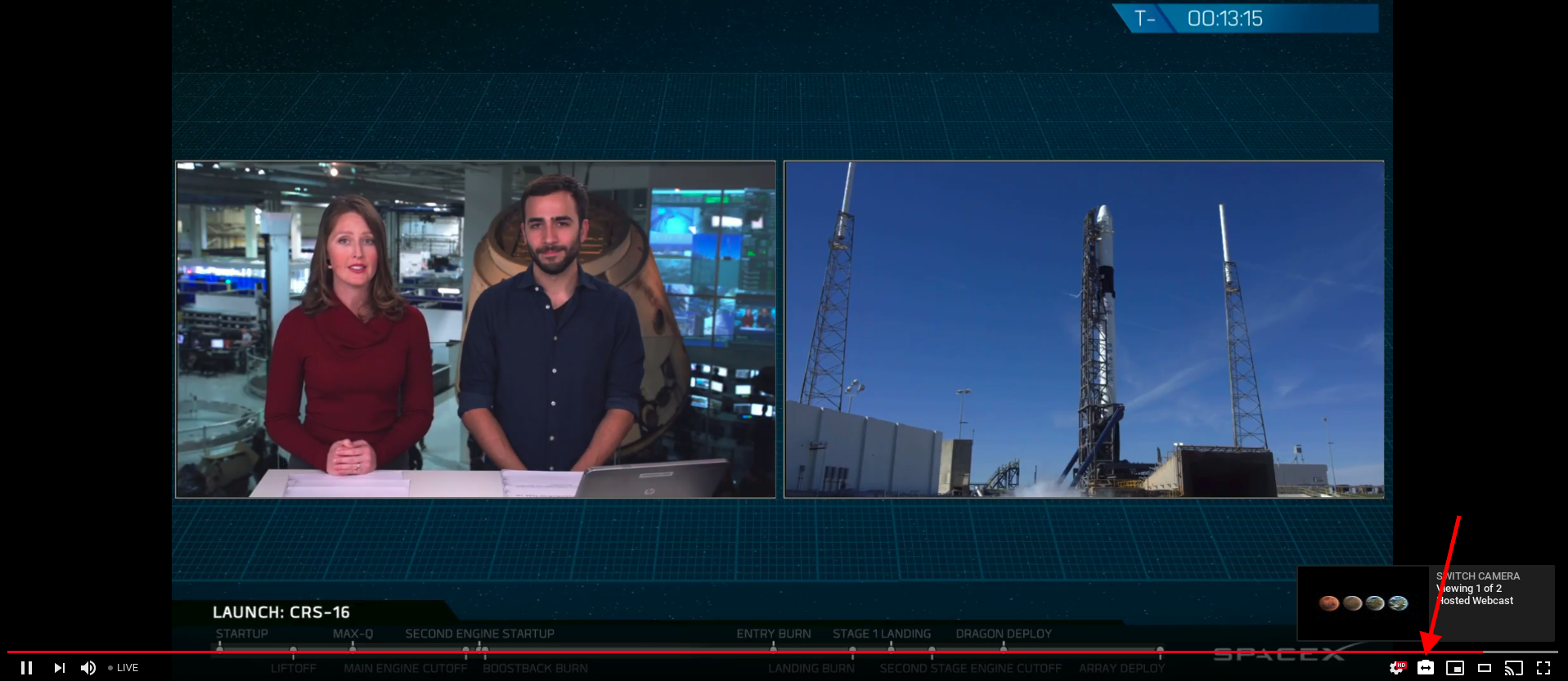 Segnalo che nella diretta SpaceX sono disponibili due viste riprese da telecamere selezionabili con l’icona indicata nella freccia in questa schermata.