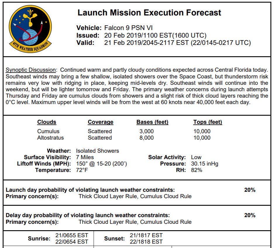 Ad L-1 il meteo indica un 80% di condizioni buone per il lancio sia domani che venerdì. Finestra di lancio 32 minuti.