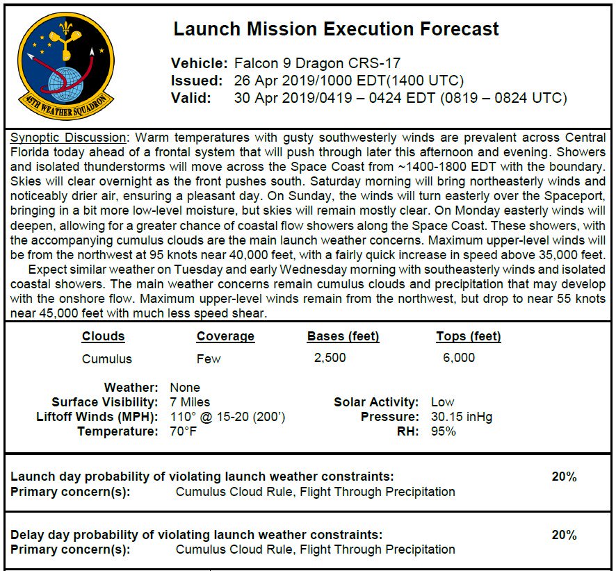 Edit: Fonti non ufficiali danno ormai il rinvio del lancio sicuro al 1° maggio ore 3:59am EDT.