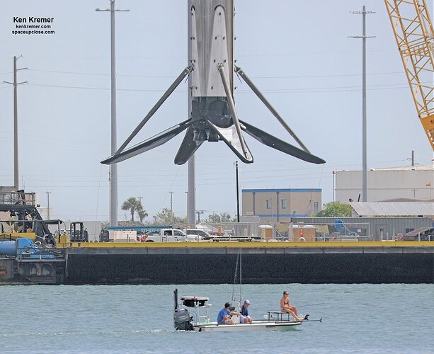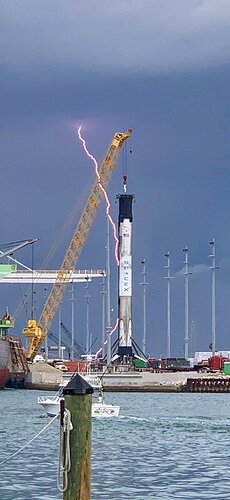 Il fulmine é dietro il booster, solo che la prospettiva ce lo fa sembrare come se lo colpisse (se mai fosse accaduto, avrebbe dovuto colpire la punta della gru visto che é il punto di scarica a terra più veloce)