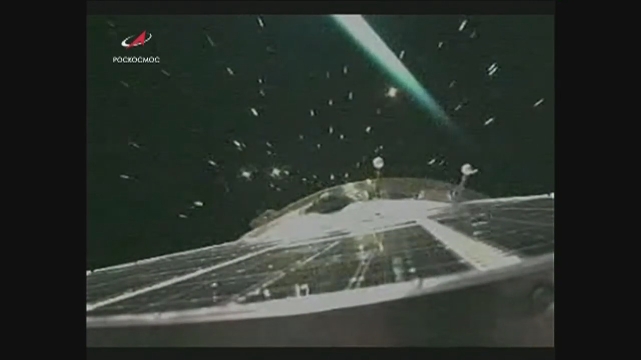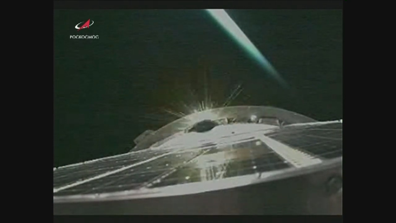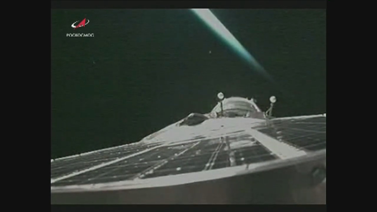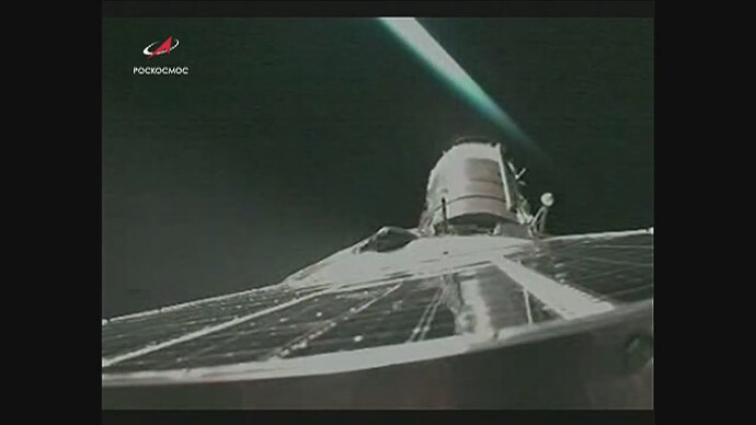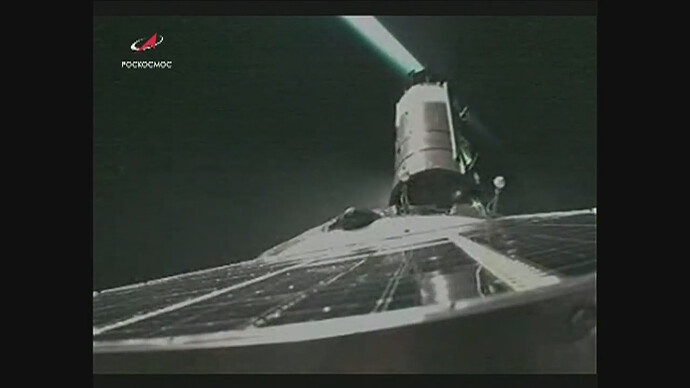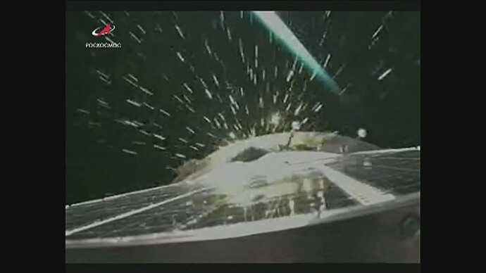 Ma lasciamo gli aspetti umani per quelli “tecnici”. La diretta NASATV ha mostrato le bellissime immagini del distacco del terzo stadio (che si sono perse nella diretta russa). Guardando il video con attenzione si notano particolari interessanti. Dopo la separazione, il bordo inferiore della Sojuz appare così: