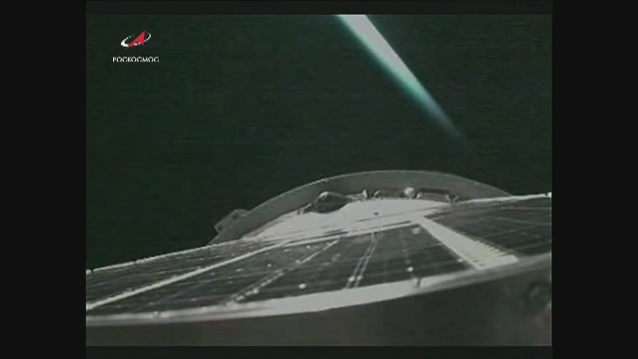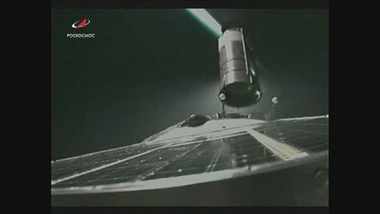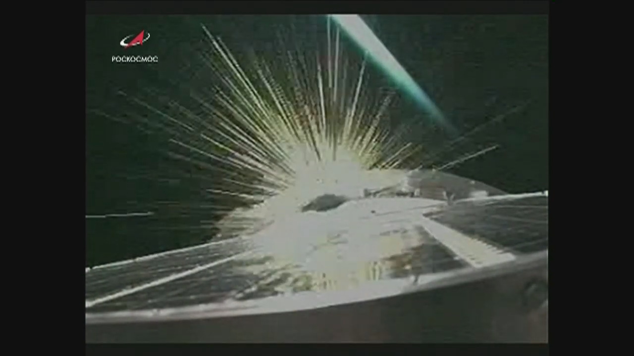 Ma lasciamo gli aspetti umani per quelli “tecnici”. La diretta NASATV ha mostrato le bellissime immagini del distacco del terzo stadio (che si sono perse nella diretta russa). Guardando il video con attenzione si notano particolari interessanti. Dopo la separazione, il bordo inferiore della Sojuz appare così: