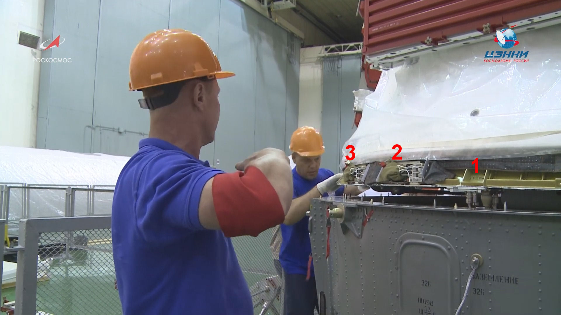 Da altre immagini si nota che prima della connessione della Sojuz con l’anello questi “oggetti” vengono chiusi nei piccoli sacchetti colore di marrone che si vedono in questo fotogramma (sempre dal video dell’integrazione dell’anello postato sopra) nelle posizioni indicate dai numeri 3 e 2