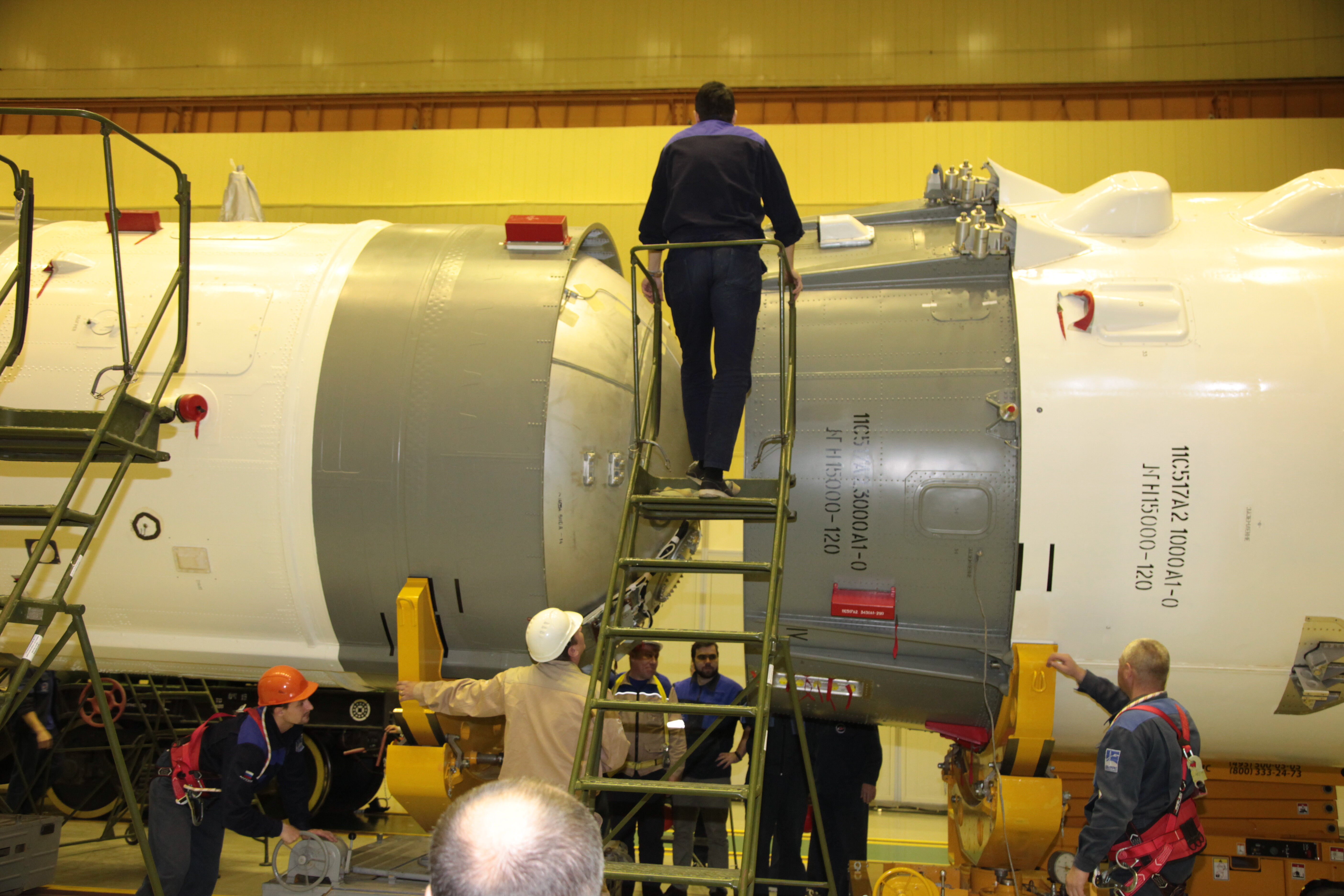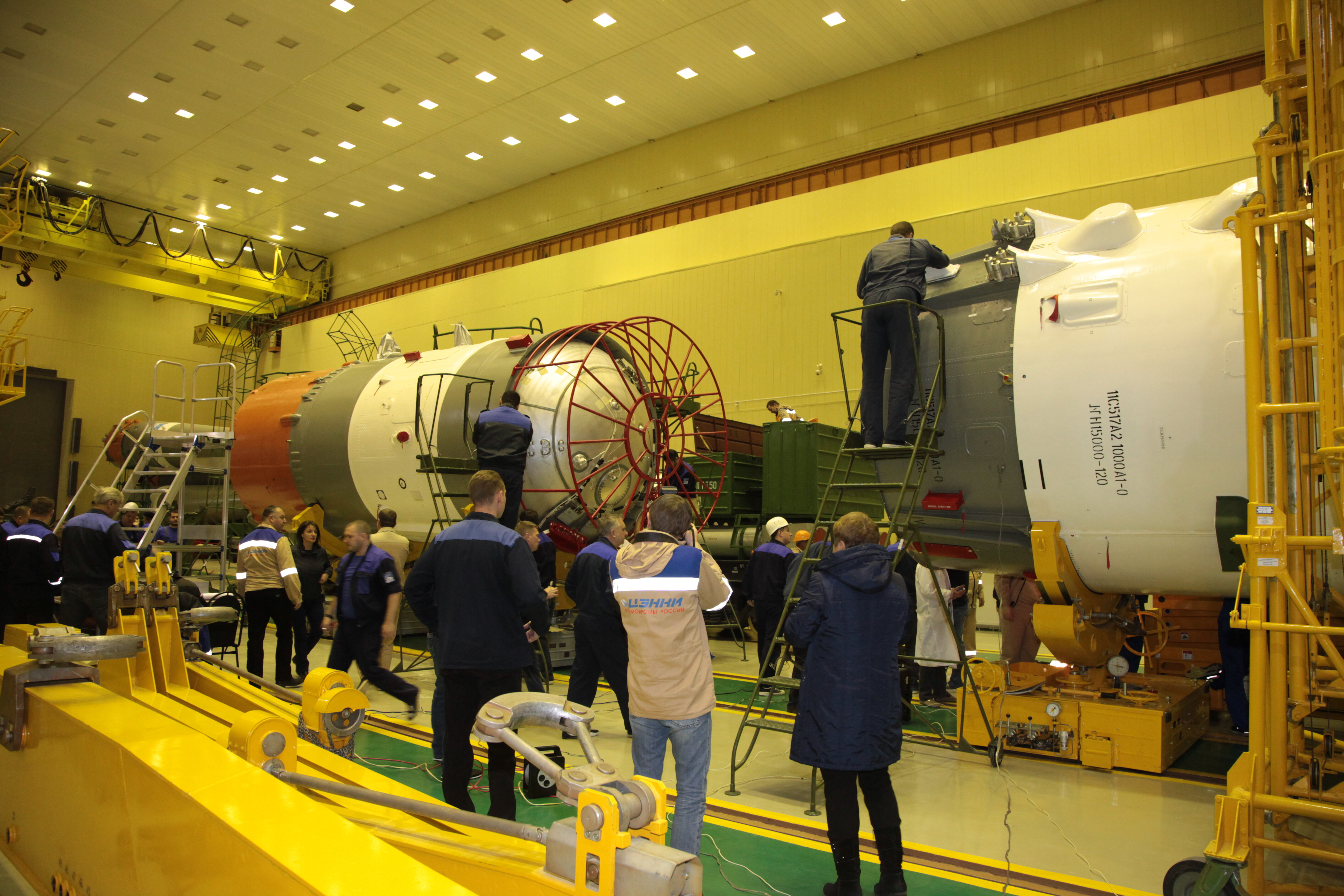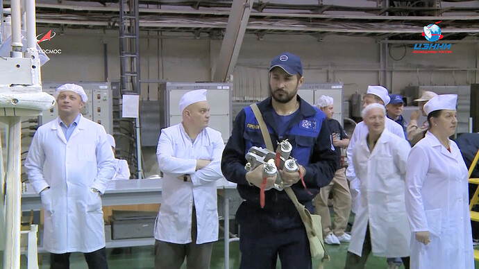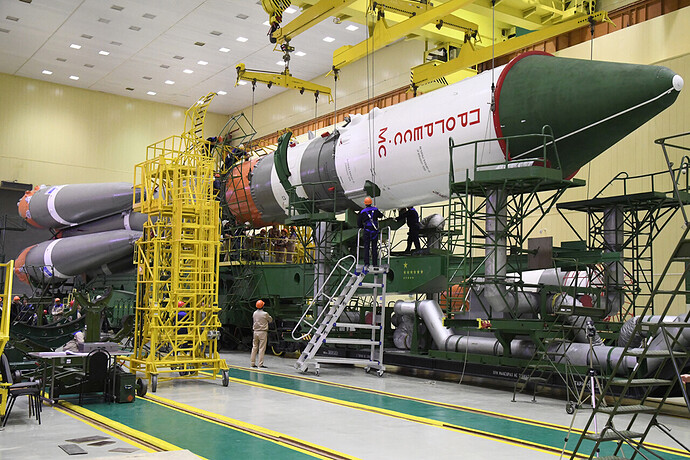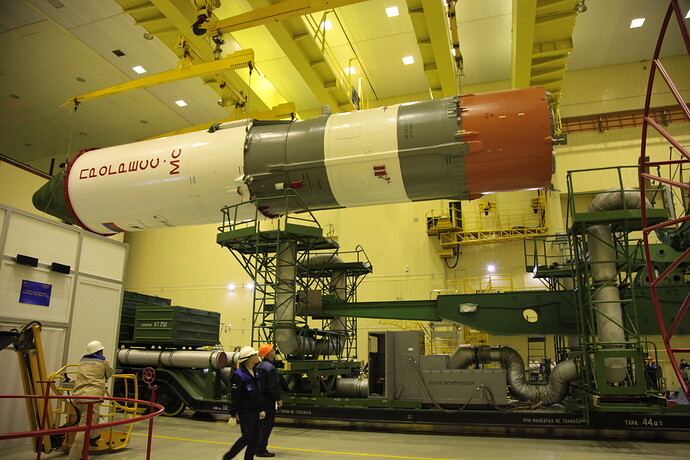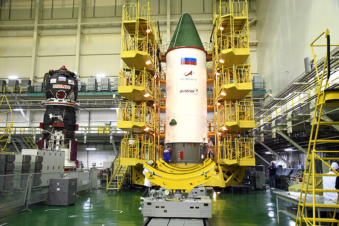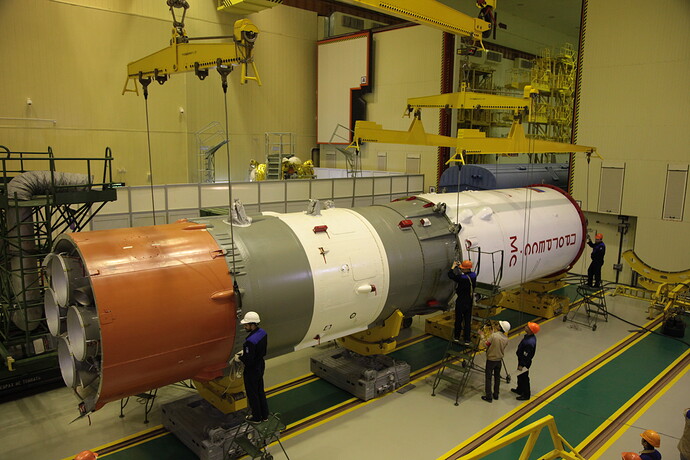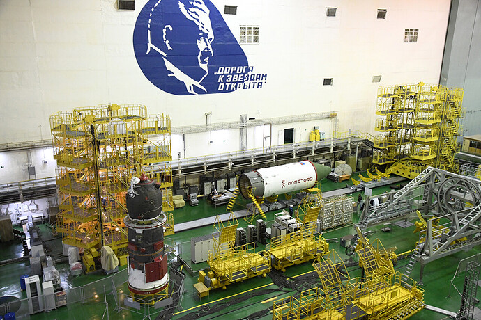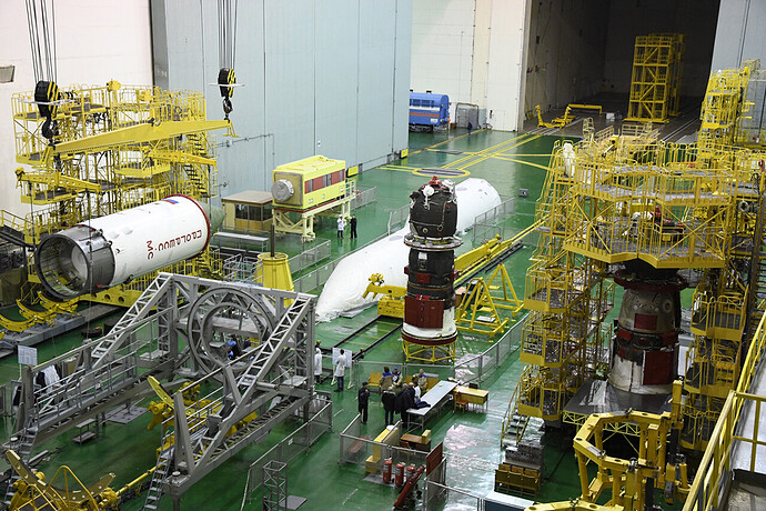 Ed eccoci nella sala di assemblaggio lanciatore presso il sito 32. Bella inquadratura che mostra l’interno dell’anello adattatore e il fondo della Progress
