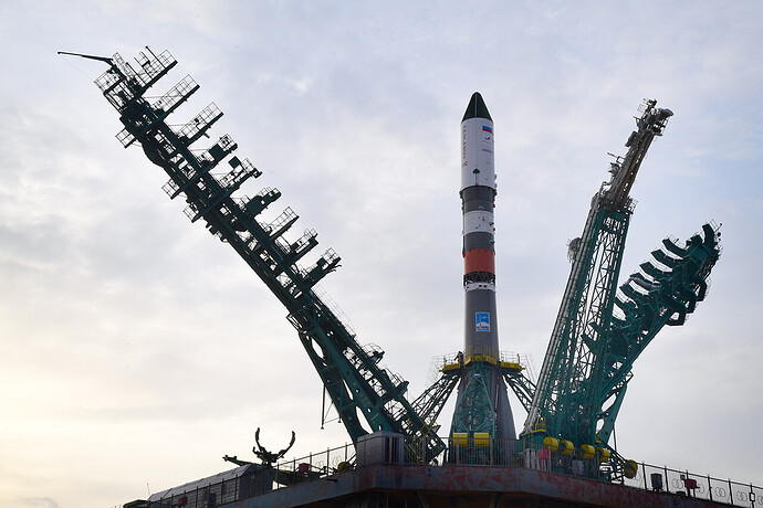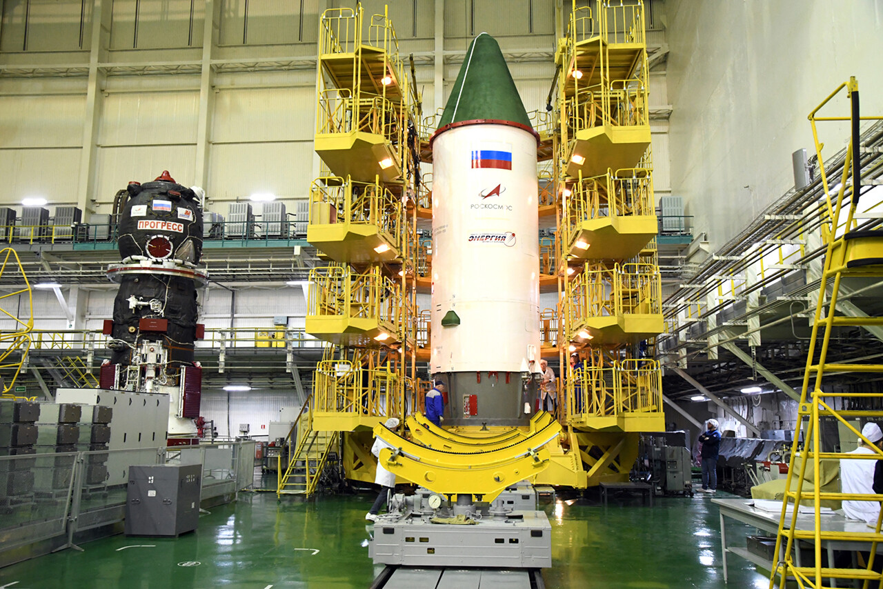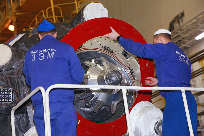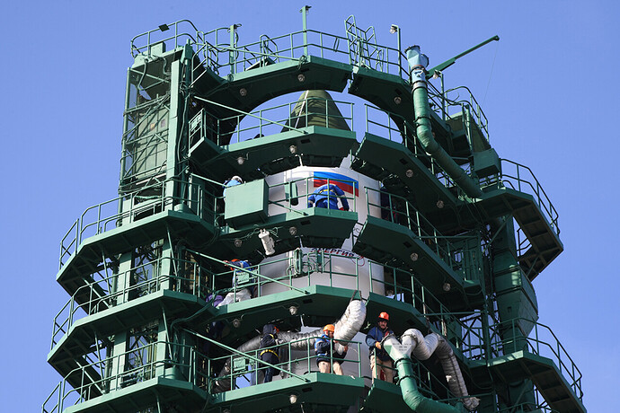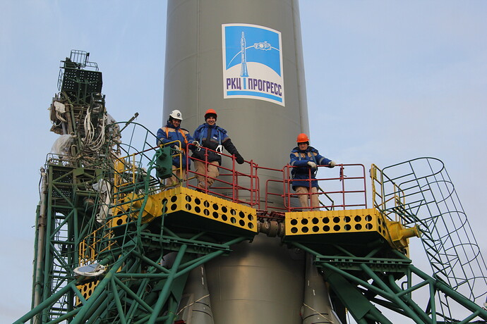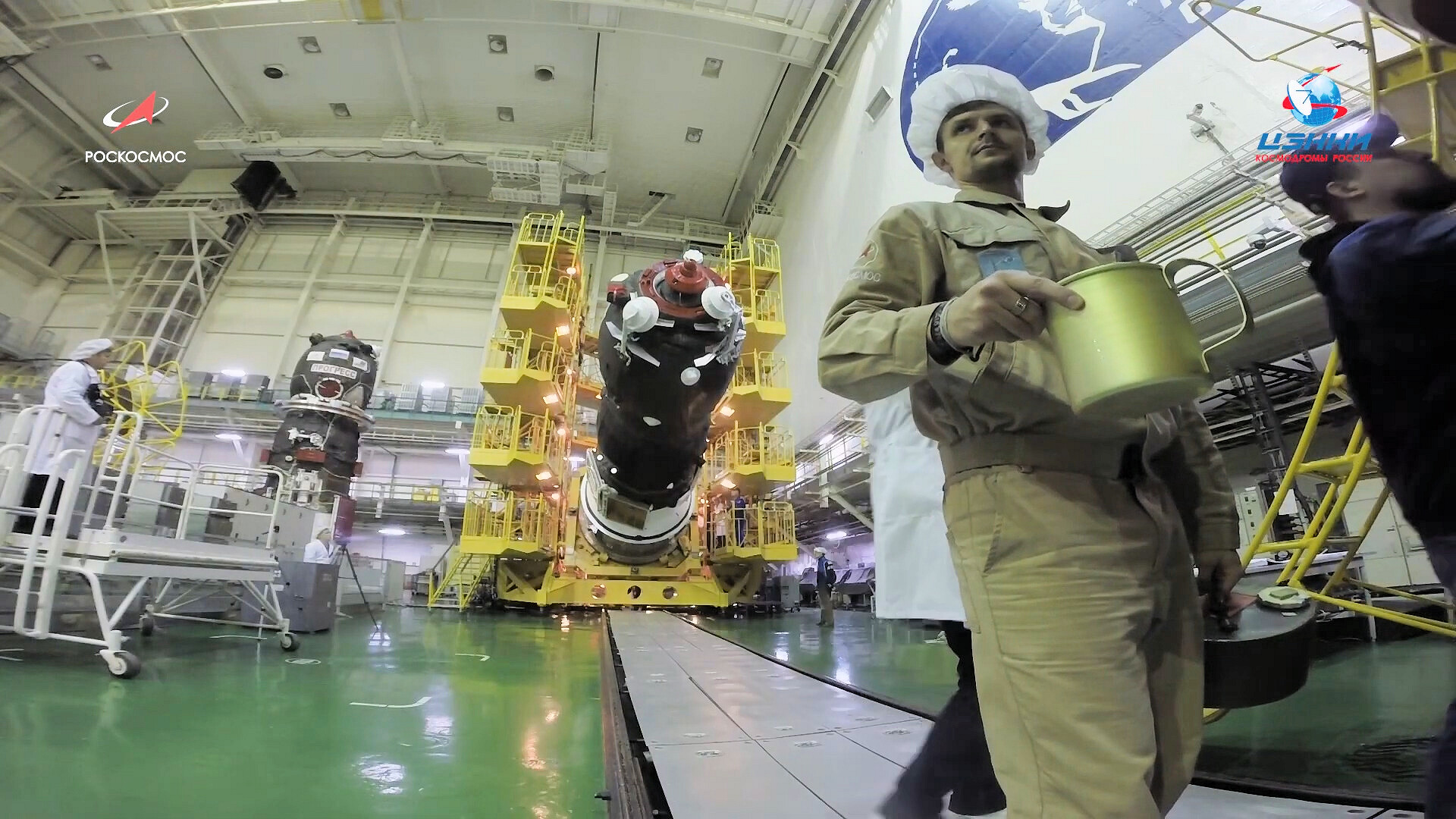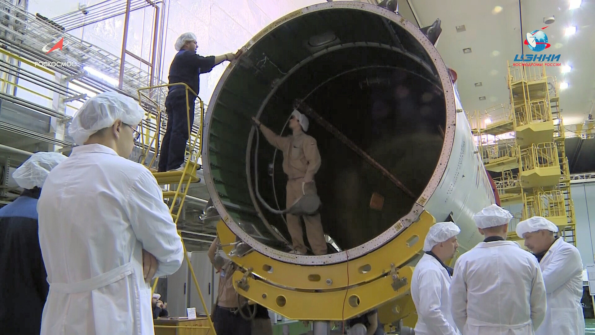 Ed eccoci nella sala di assemblaggio lanciatore presso il sito 32. Bella inquadratura che mostra l’interno dell’anello adattatore e il fondo della Progress