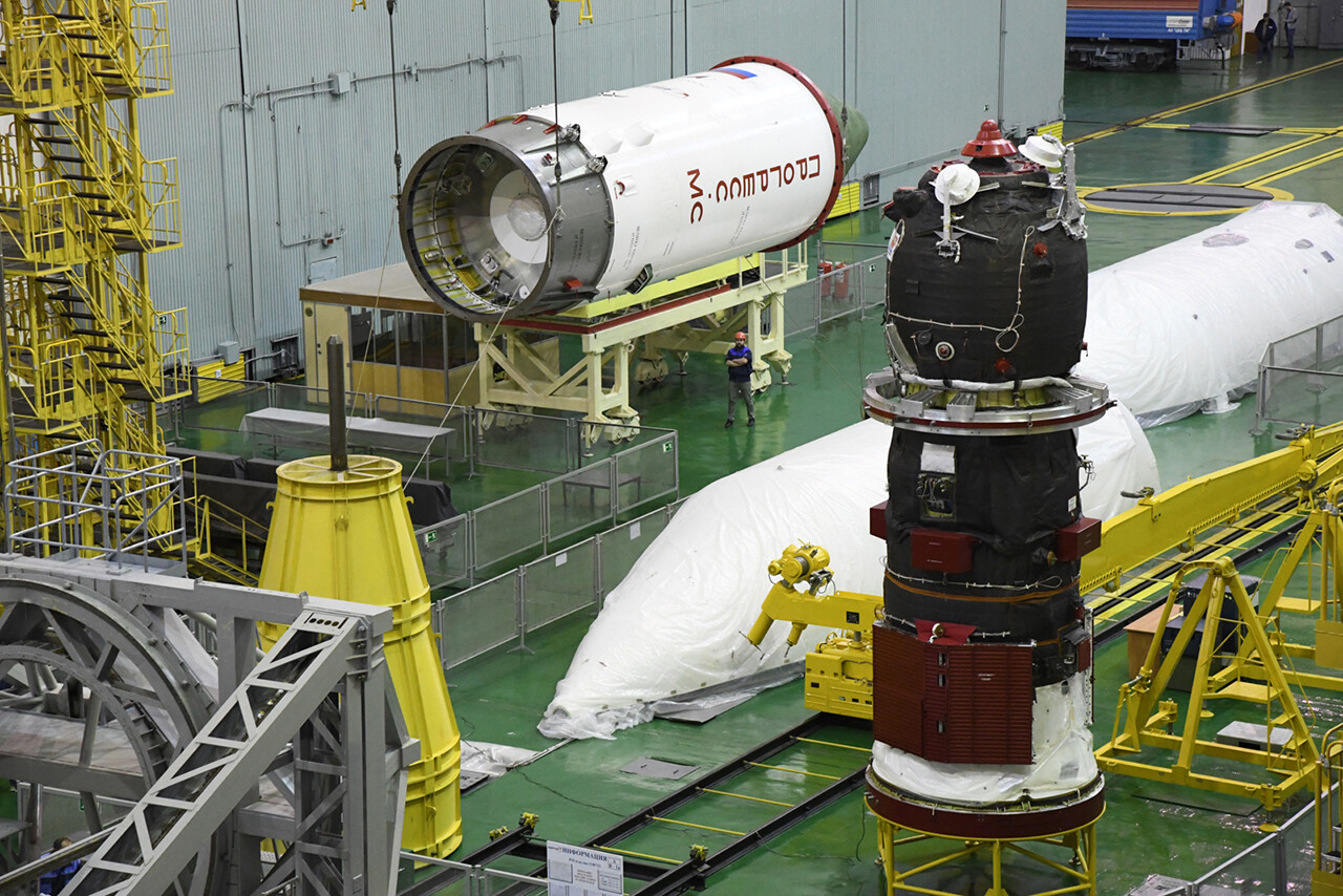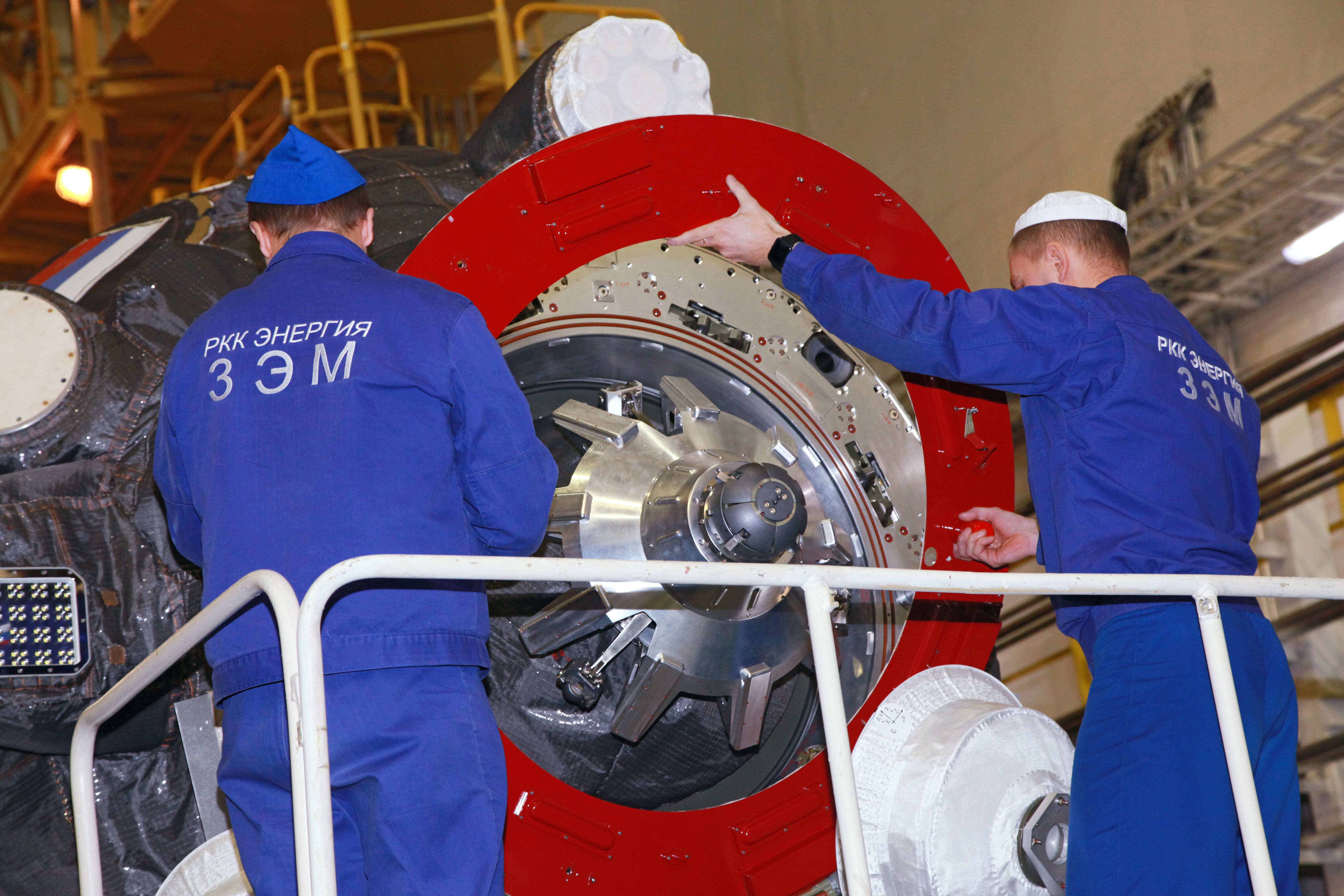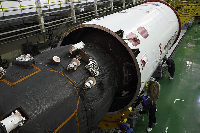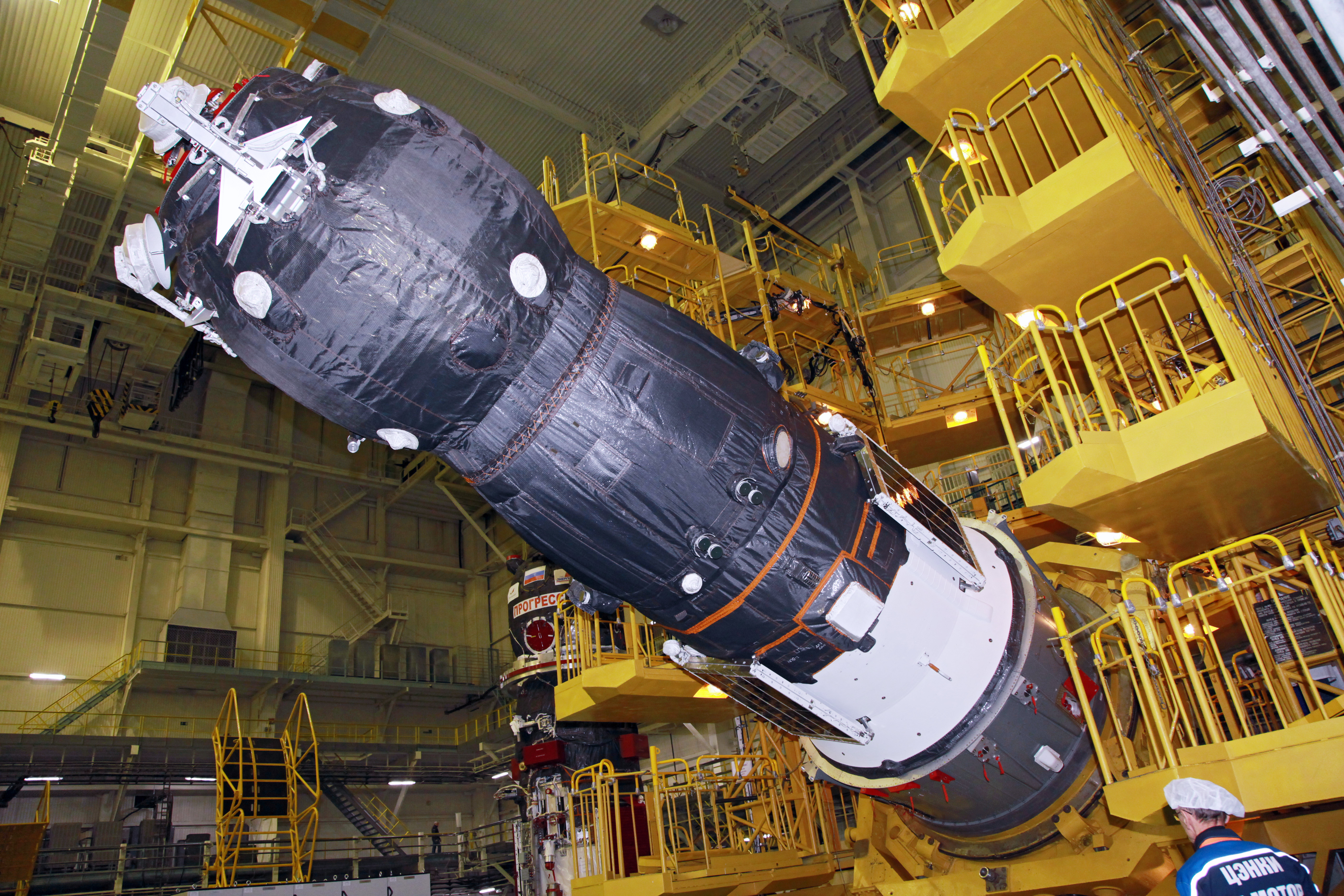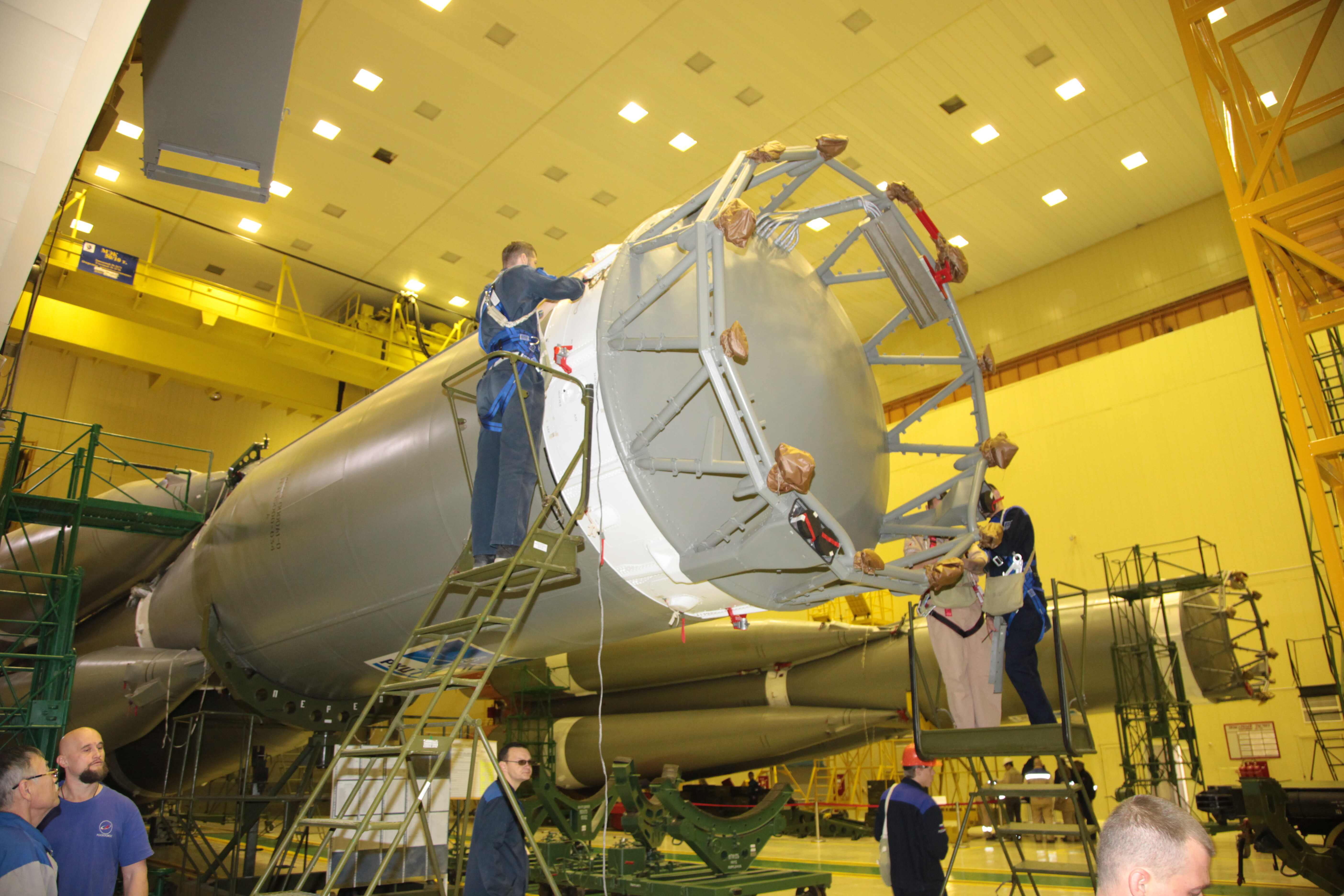 Dopo una rapida e minuziosa ispezione del fairing, da notare i “tappi” grigi (fori d’ispezione) che permettono di lavorare alla navicella anche in un secondo momento, la Progress è stata calata piano piano nella sua copertura.