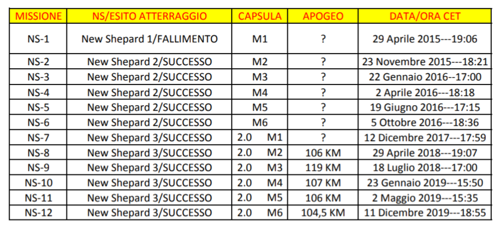 Tabella riassuntiva fatta da me di tutti i lanci di Blue Origin: