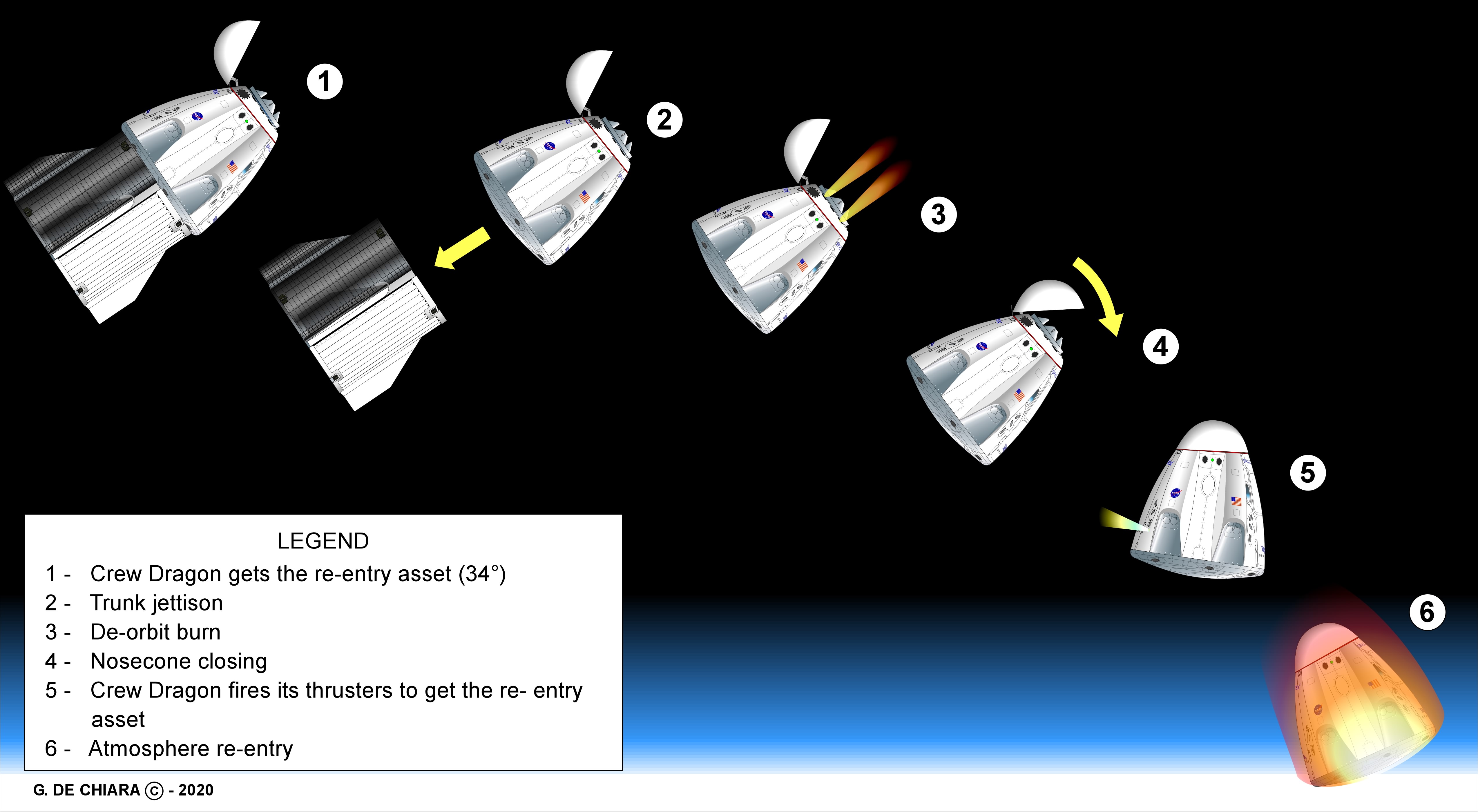 | August 2, 2020 6:01:00 PM | Completamento dell’accensione di deorbitazione (deorbit burn) |