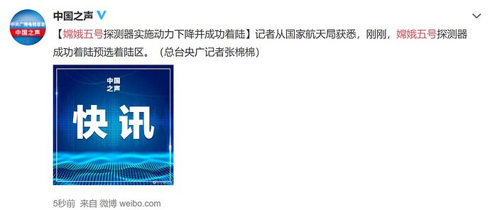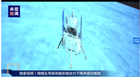 Chinese state television reports the Chang’e 5 spacecraft has successfully landed on the moon to collect samples for return to Earth.