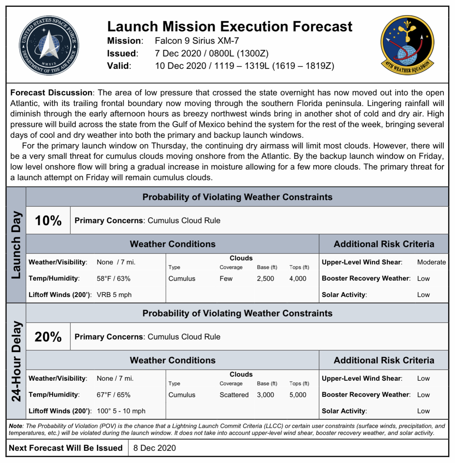 Lo spostamento potrebbe anche essre causato dalla presenza nel pad a fianco del Delta IV Heavy con NROL-44 e programmato per le 2020-12-10T23:15:00Z e con una finestra di lancio 2020-12-10T22:50:00Z → 2020-12-11T03:30:00Z.