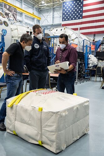 In queste fotografie scattate il 18 novembre 2020, Thomas Pesquet e Akihiko Hoshide hanno ricevuto una lezione sul corretto imballaggio delle tute EMU. Esse sono spedite e ritornano dalla Stazione Spaziale Internazionale in queste borse ed è importante imballarle correttamente per evitare danni.