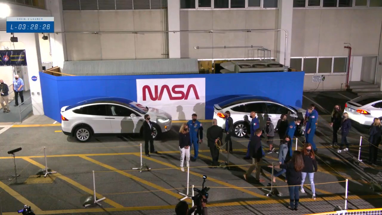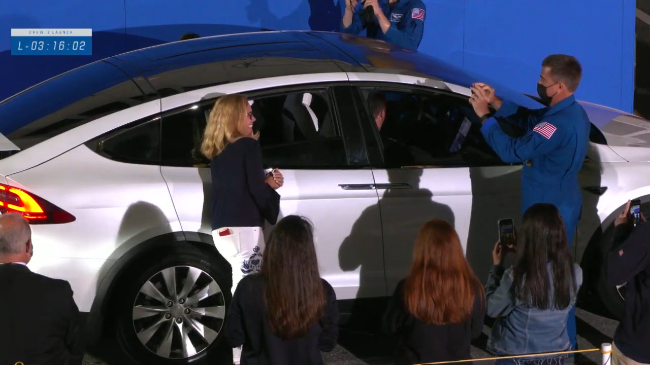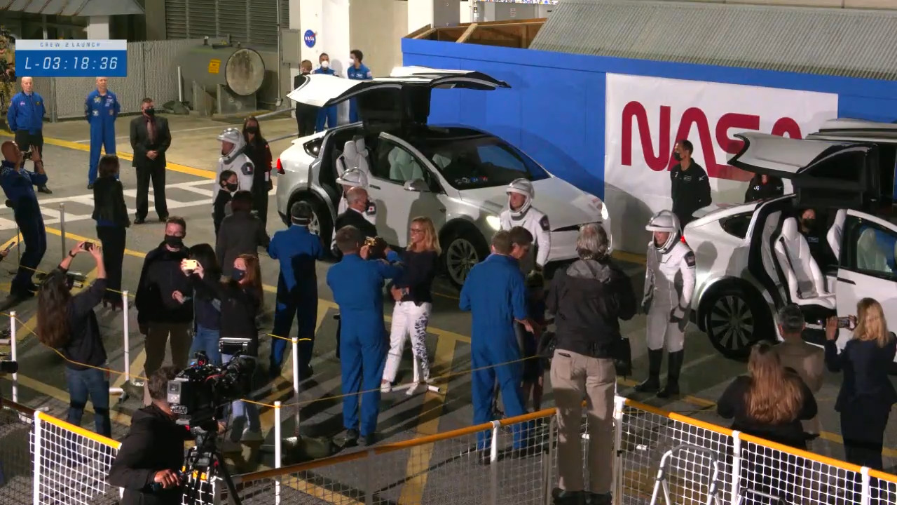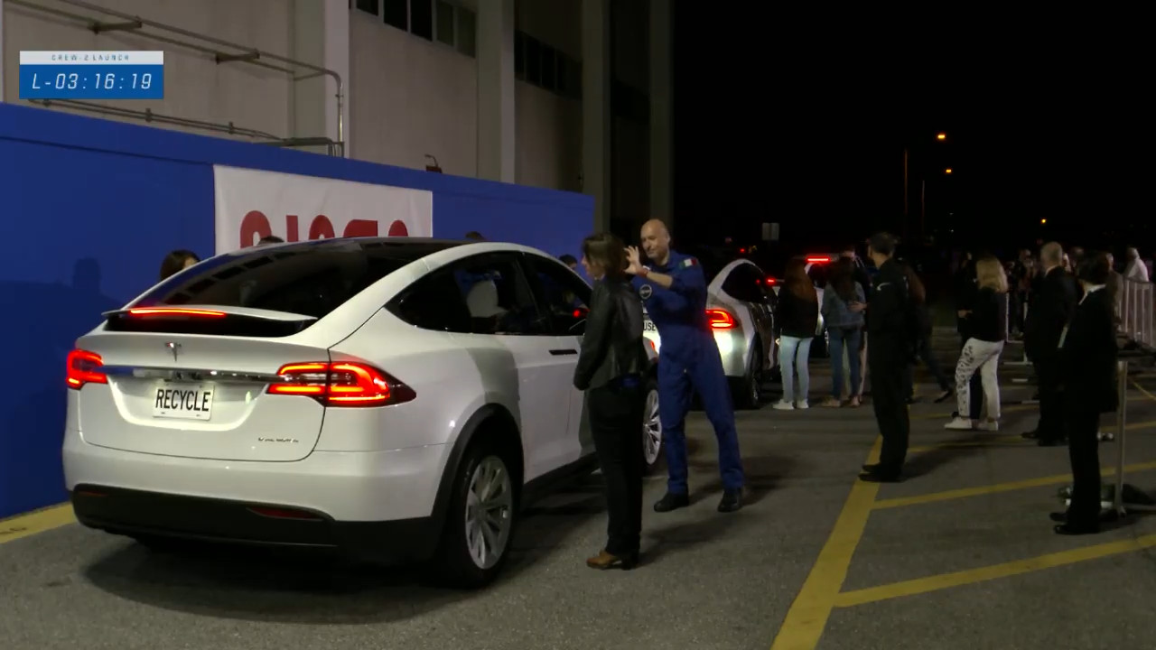 L’equipaggio al completo, i VIP e i loro amici e familiari sono arrivati alla zona dove le Tesla aspettano per portarli alla rampa di lancio. È il momento dei saluti.