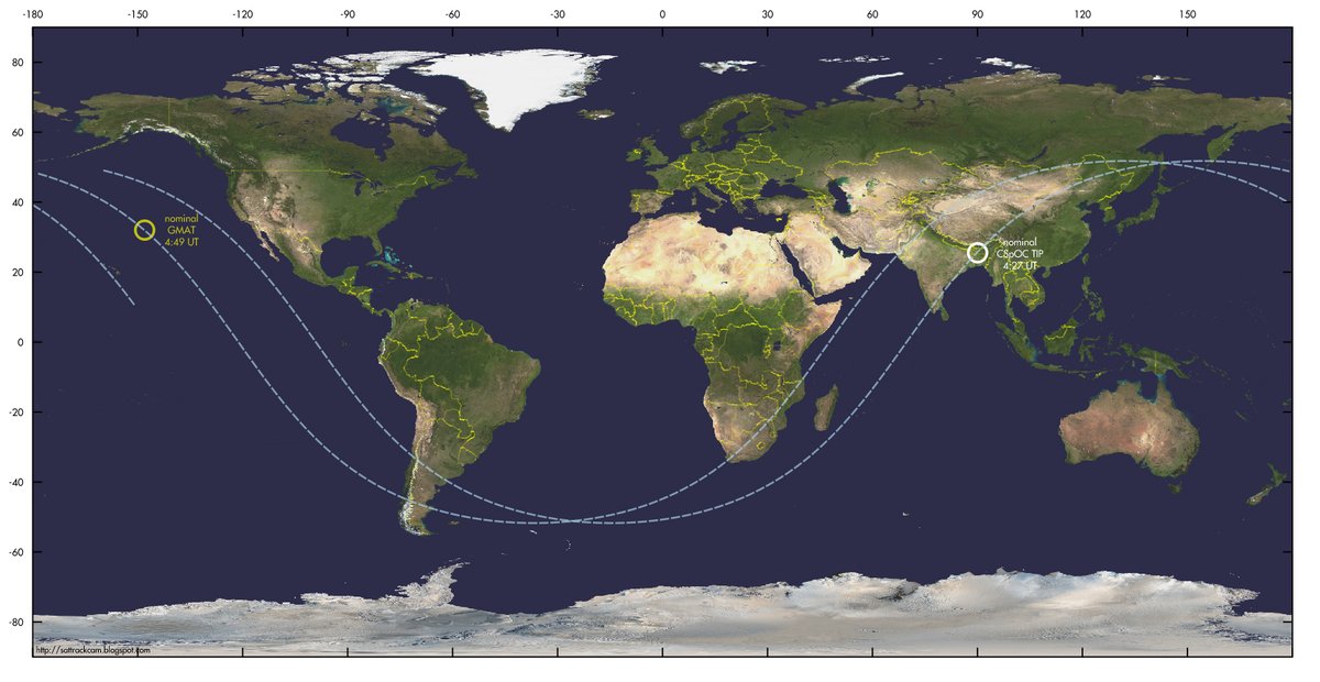 Il terzo stadio del Proton è rientrato nella notte, in una qualunque posizione della linea sulla mappa. Nuovi dati più aggiornati potrebbero permettere di migliorare la precisione sulla zona di rientro.