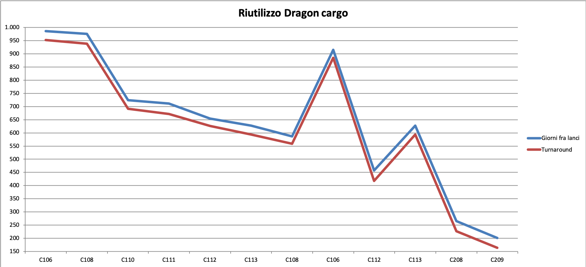 Ha inoltre stabilito il nuovo record di riutilizzo di una Dragon cargo, come mostra il grafico sottostante, con 201 giorni fra due lanci e 164 giorni dall’atterraggio precedente della stessa capsula.