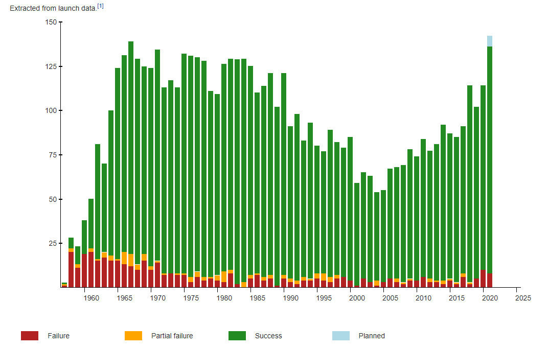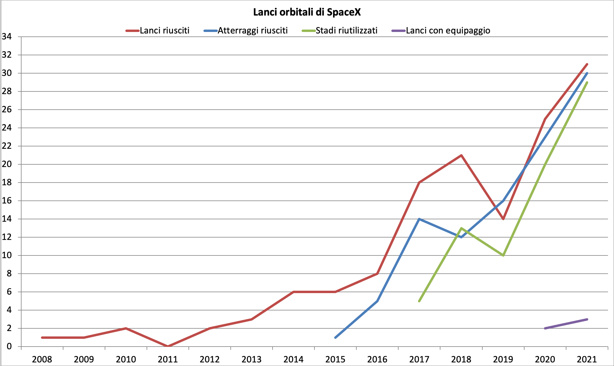 In questo 2021 ha stabilito il nuovo record di lanci, atterraggi, riutilizzi e lanci con equipaggio come mostrato dal grafico sottostante.