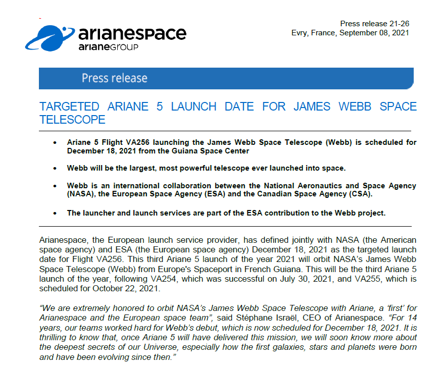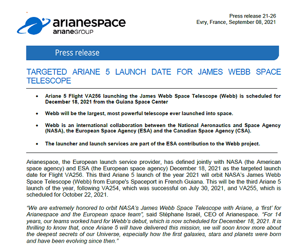 Abbiamo una data. 2021-12-17T23:00:00Z. È un sabato, speriamo lo facciano in orario comodo per poterci finalmente gustare JWST che decolla.