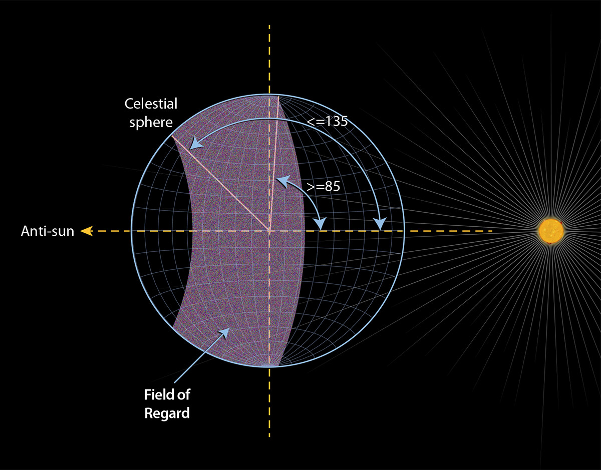 In pratica immaginando di stare in piedi sullo schermo solare del telescopio, questo Field of Regard non sarebbe altro che una fascia di cielo alta qualche decina di gradi e che ci gira intorno a 360 gradi.