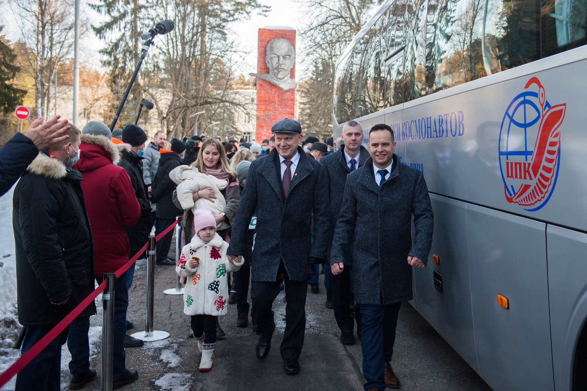 …i cosmonauti e i relativi team sono partiti da Star City in autobus fino all’aeroporto Chkalovsky, presso Mosca.