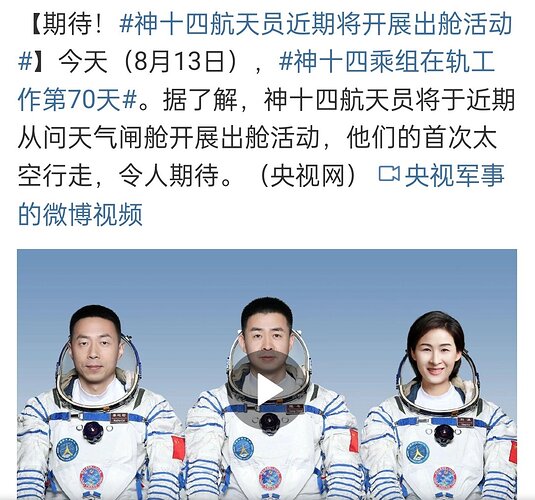 Chen Dong e Liu Yang, protagonisti dell’EVA odierna all’esterno della CSS, non solo sono coscritti (1978) ma sono nati a soli 67 giorni di distanza. Per trovare un duo in EVA con una differenza d’età inferiore bisogna tornare al maggio 2009 quando Michael Massimino e Michael Good fecero due EVA durante la missione STS 125 con una differenza d’età di 55 giorni.