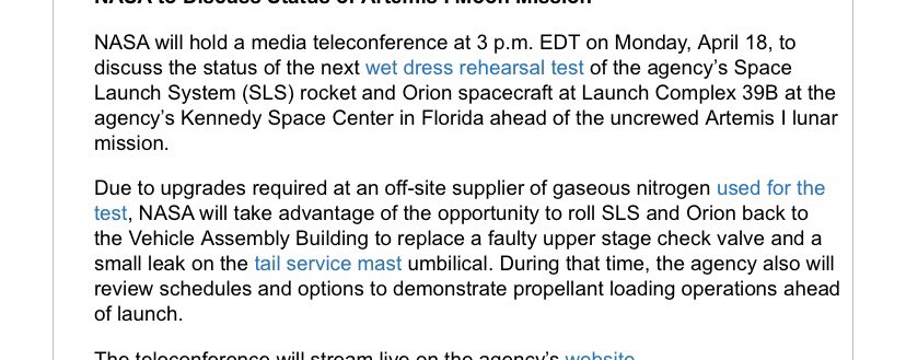 2022-05-05T19:30:00Z ne sapremo di più. La dirigenza di NASA ha indetto una conferenza stampa per aggiornare il pubblico sul prossimo passo di SLS.
