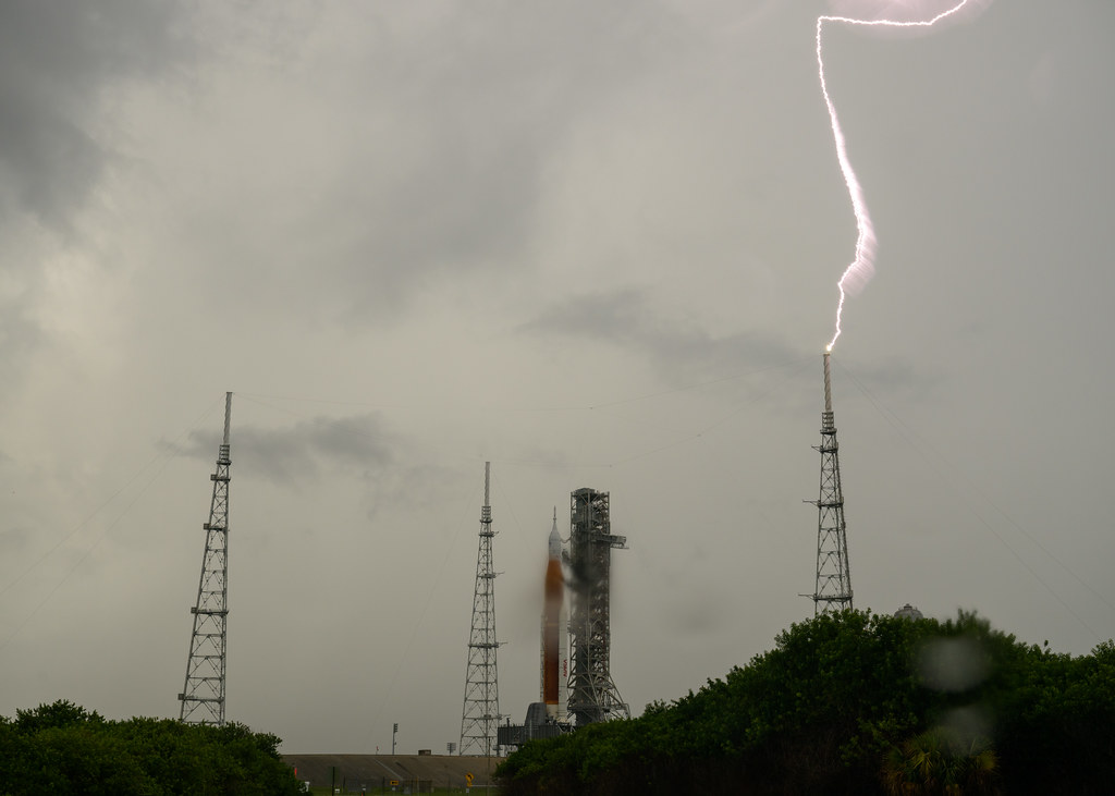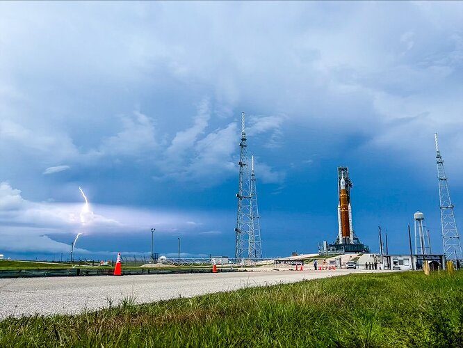 Circa 11 ore fa da quando scrivo, tre fulmini sono stati attratti da due dei tre parafulmini alti 180 metri a protezione della rampa di lancio 39B. Fortunatamente le scariche elettriche erano di bassa intensità e sembra che SLS sia in forma smagliante non essendo pervenute ulteriori comunicazioni. Comunque il reparto addetto al monitoraggio meteo analizzerà il fenomeno atmosferico e condividerà i dati con il personale più esperto che determinerà l’eventuale violazione dei limiti di sicurezza.