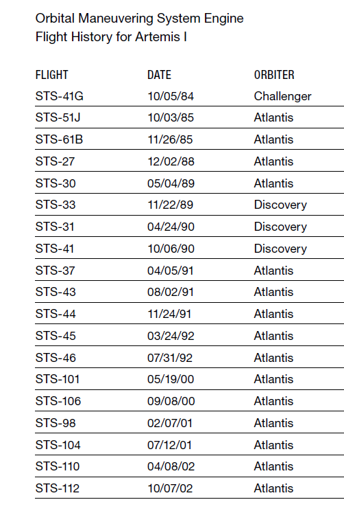 Non sapevo, o meglio mi sembra di non averlo letto qui, che il propulsore principale del modulo di servizio della capsula Orion era anch’esso derivato dallo Space Shuttle. Si tratta di un AJ10-190 costruito da Aerojet Rocketdyne, capace di sviluppare una spinta di 33 kN. Ieri come oggi, questo propulsore era impiegato nelle manovre orbitali in orbita terrestre bassa e di fatto “spostava” la navetta dopo spegnimento dei possenti RS-25. Nella sua seconda vita con Orion avrà il compito di immettere la capsula nella traiettoria verso la Luna. Sappiamo per giunta il passato di volo di questo motore a razzo, ecco la lista delle missioni in cui è stato protagonista.