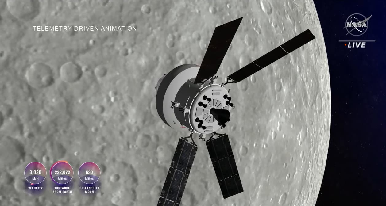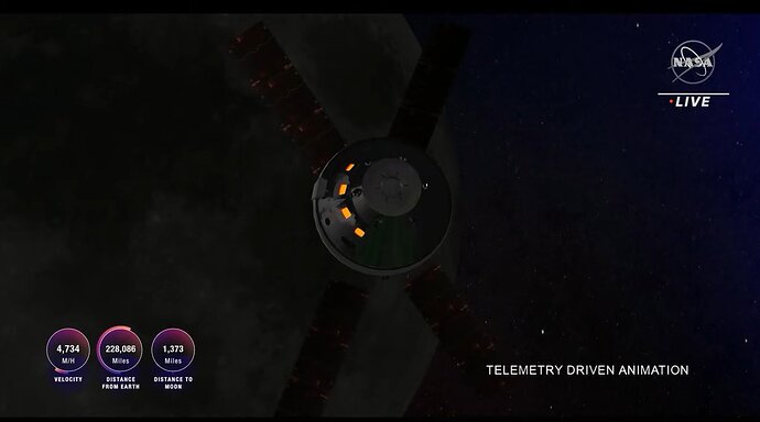 Orion dovrebbe ora essere al suo perilunio (< 140 km).