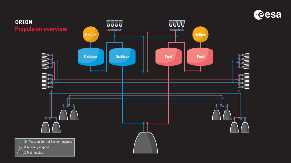 Intanto ESA pubblica sul suo sito qualche dettaglio sul funzionamento del sistema propulsivo dello European Service Module (ESM).