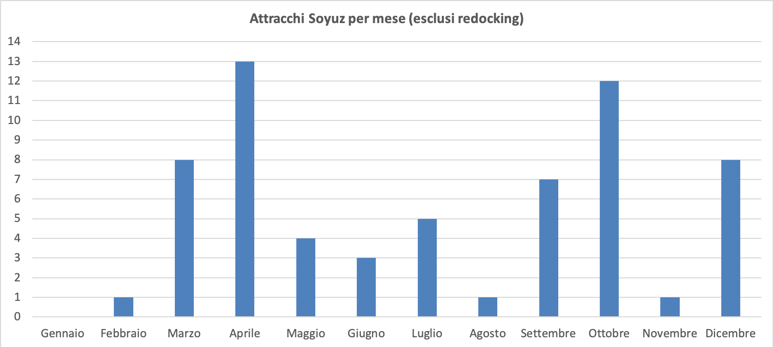 Per la prima volta una Soyuz partita da Terra attracca alla ISS nel mese di febbraio. Il mese più gettonato è aprile, con 13 attracchi, seguito da ottobre con 12 e da marzo e dicembre con 8. Occupata quindi per la prima volta la casella di febbraio, rimane vuota solo quella di gennaio.