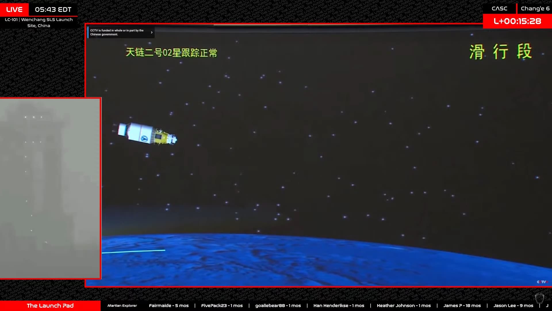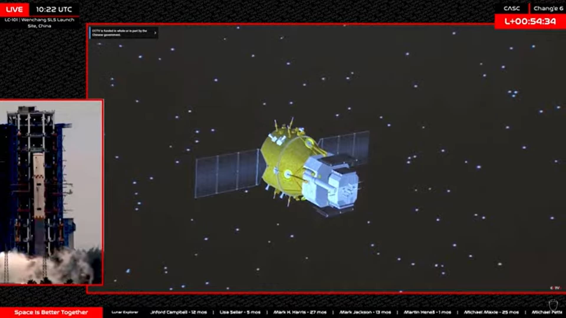 Attualmente la sonda è in LOS in attesa di riagganciare una delle “Tracking Ship” classe Yuang Wang (https://en.wikipedia.org/wiki/Yuan_Wang-class_tracking_ship) per connettersi al centro di lancio e controllo di Wenchang (https://en.wikipedia.org/wiki/Wenchang_Space_Launch_Site).
