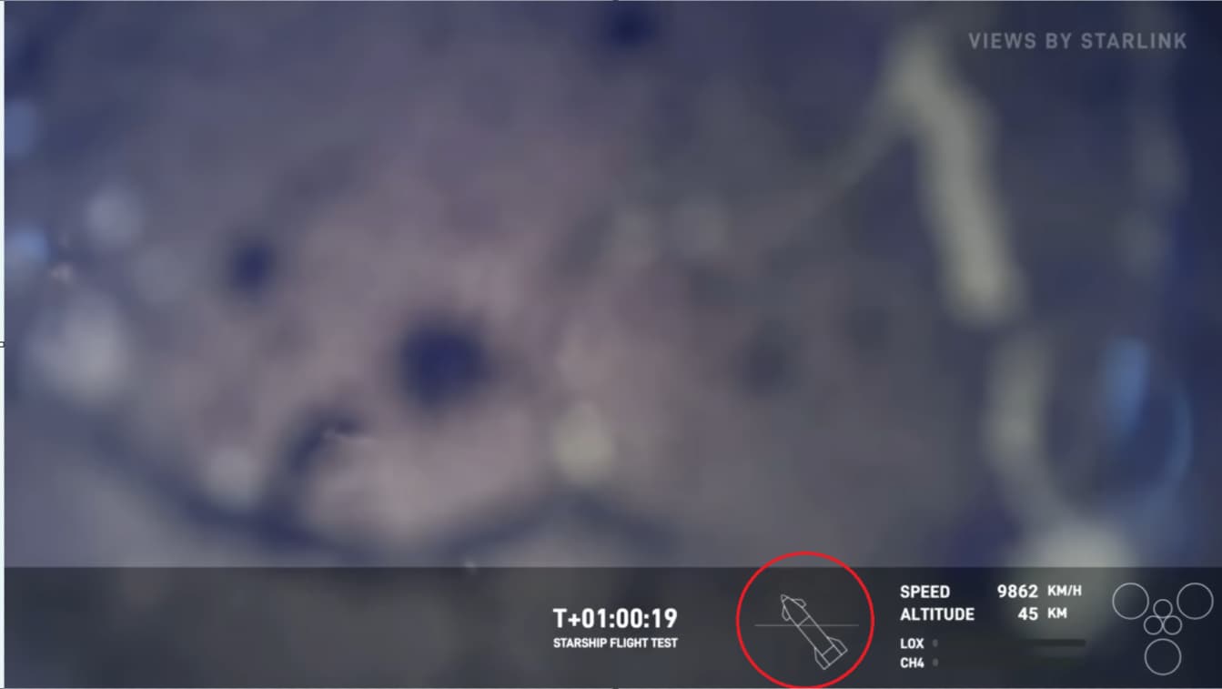 Il rientro è avvenuto con un angolo di attacco molto minore rispetto allo Shuttle, la prova sta nel fatto che Starship ha “galleggiato” (come altro definirlo?) tra gli 80 ed i 60 km di quota passando da 26.700 km/h ai 19.500 km/h per una durata di ben 7 minuti (da 00:48:00 a 00:55:00).