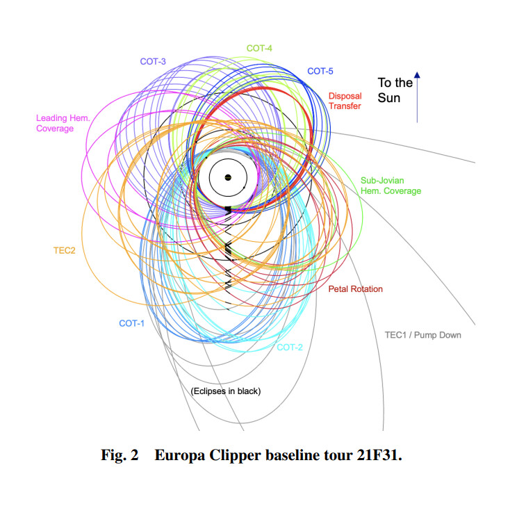Finalmente ho trovato un plot dell’orbita della sonda attorno a Giove, si vede chiaramente che il periapside è all’altezza esatta dell’orbita della luna Europa attorno a Giove. In questo modo fa le acquisizioni che deve fare e scappa lontano da Giove, dove i campi sono meno intensi.
