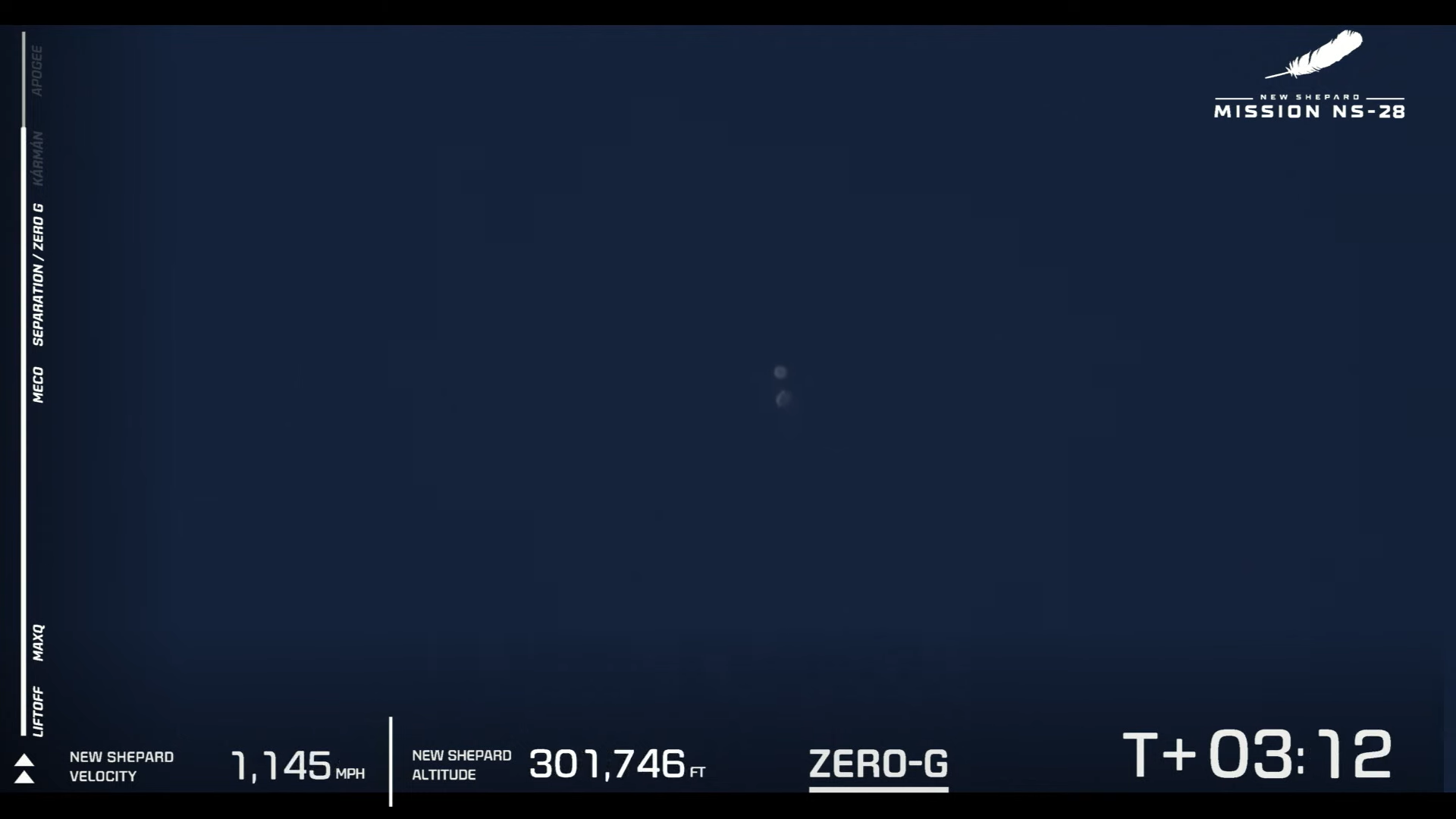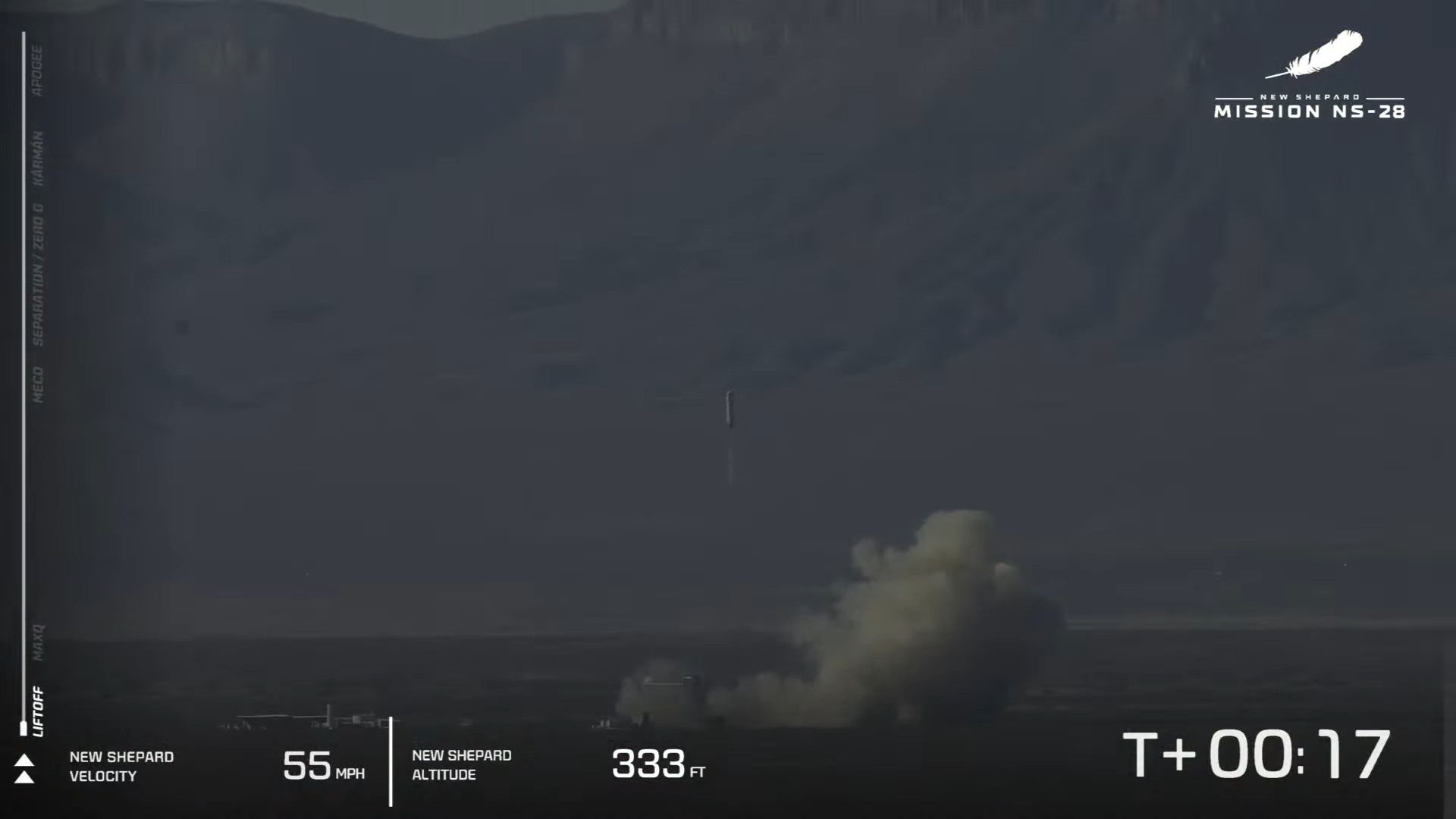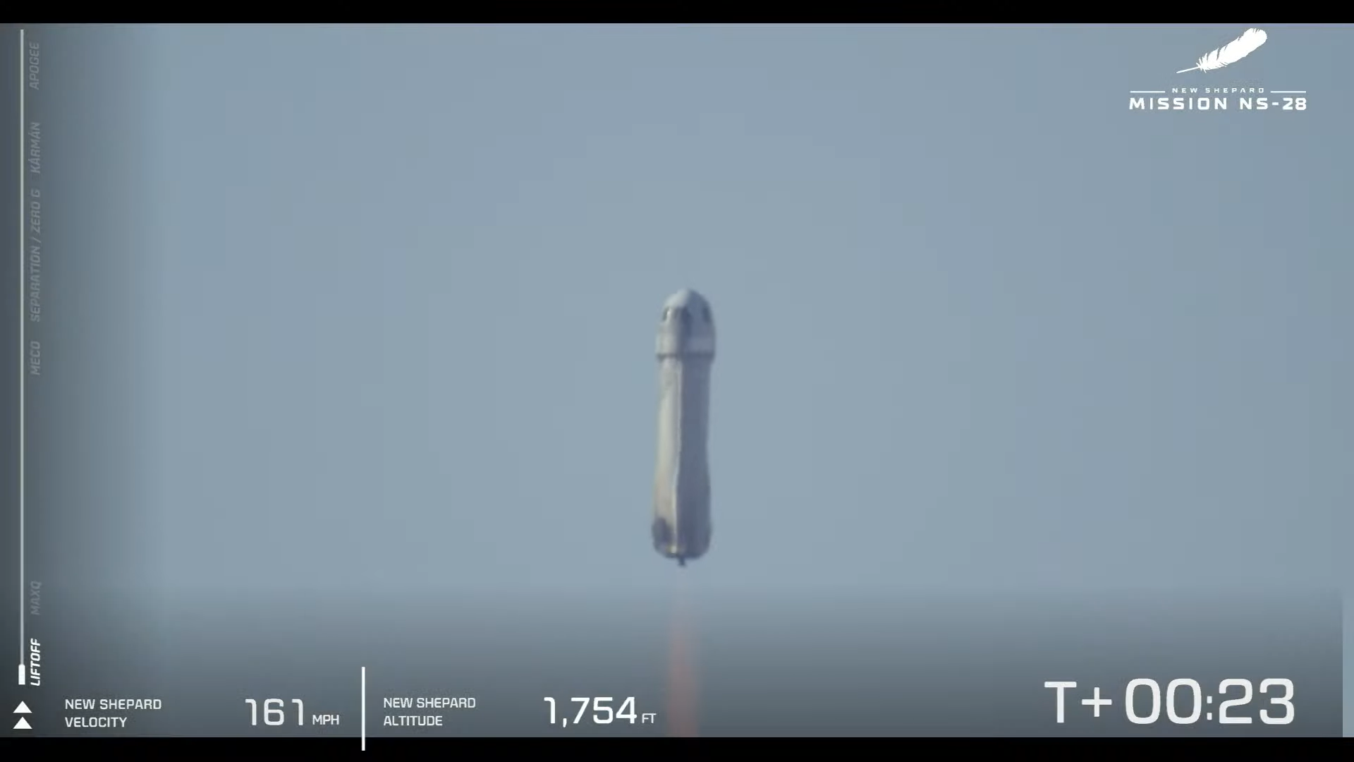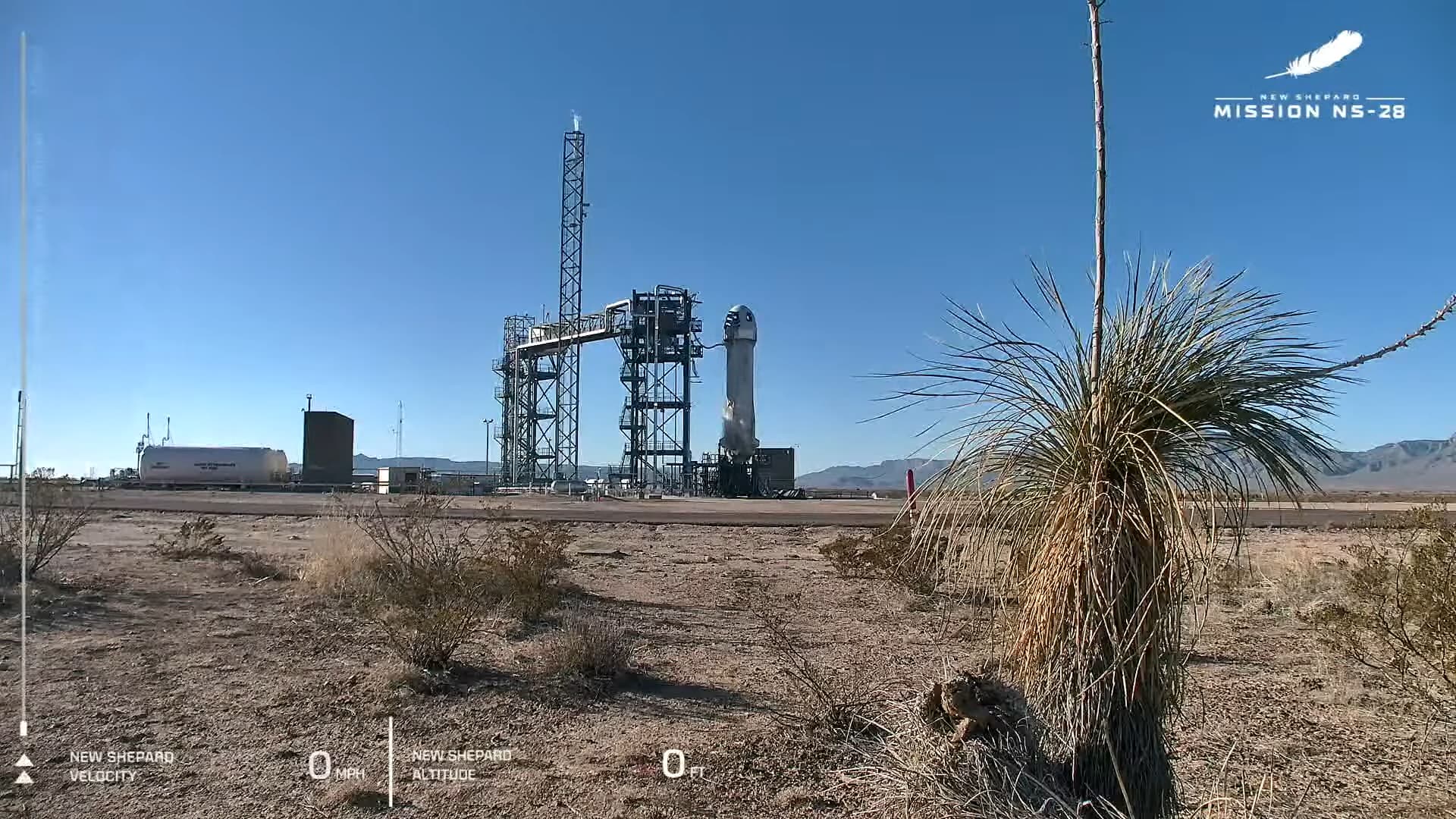 Ventottesimo di tutti i voli del programma, New Shepard ha già fatto volare 43 esseri umani sopra la linea di Kármán in nove missioni e rivola la sua decima con equipaggio portando quattro neofiti e due veterani.