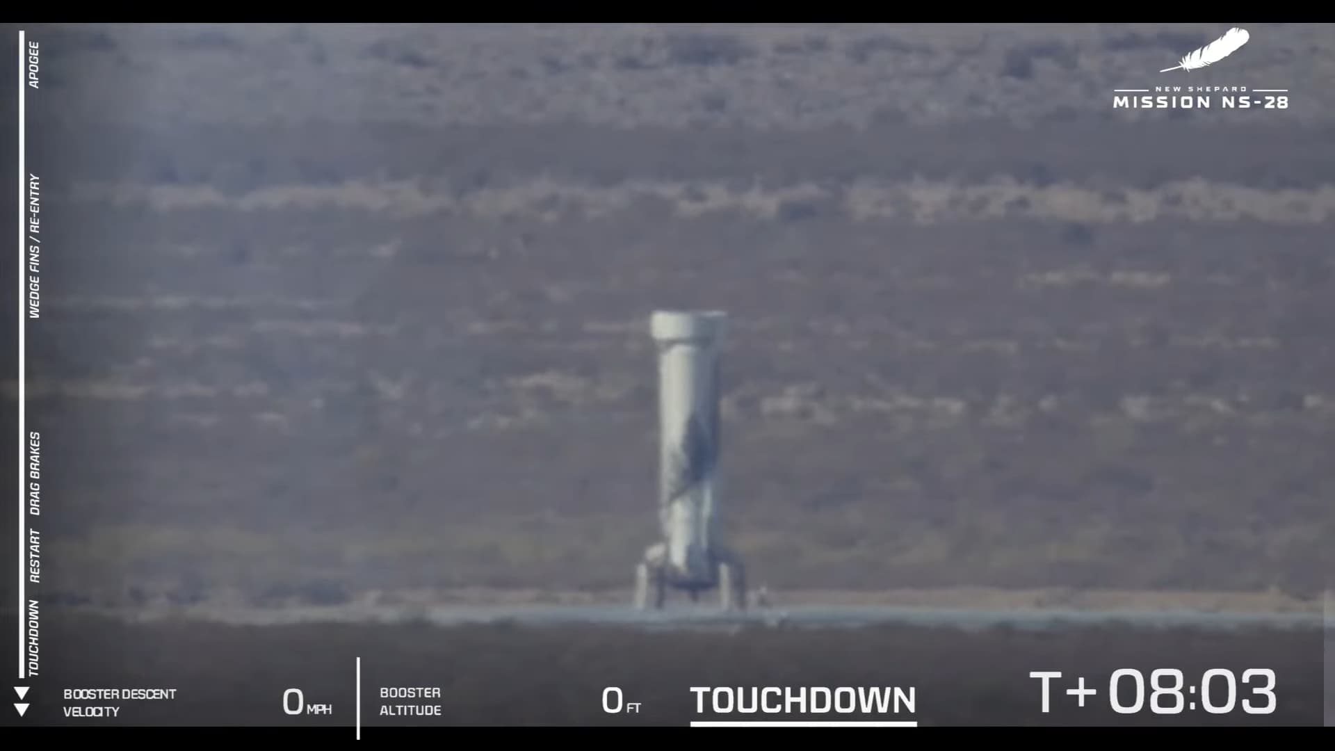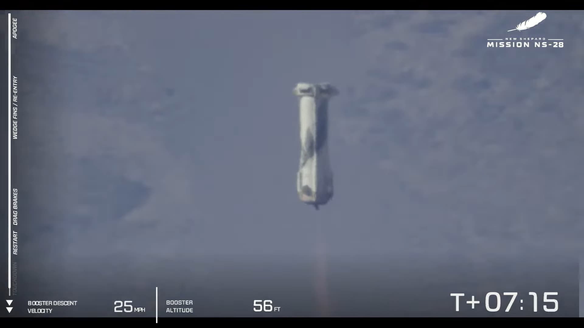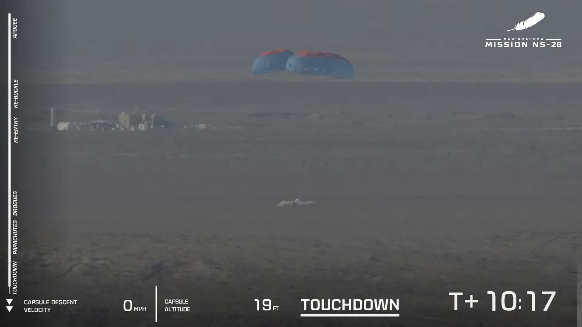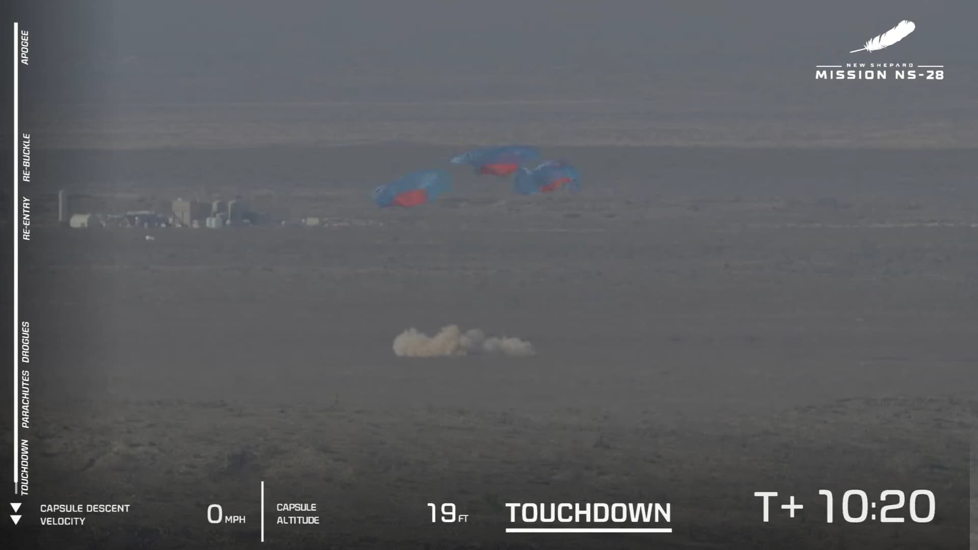 Ventottesimo di tutti i voli del programma, New Shepard ha già fatto volare 43 esseri umani sopra la linea di Kármán in nove missioni e rivola la sua decima con equipaggio portando quattro neofiti e due veterani.