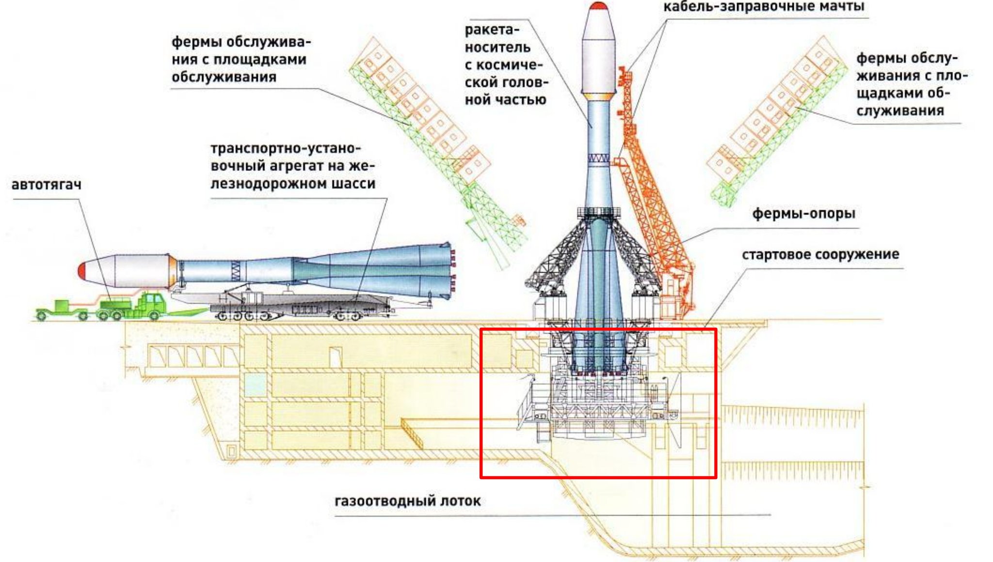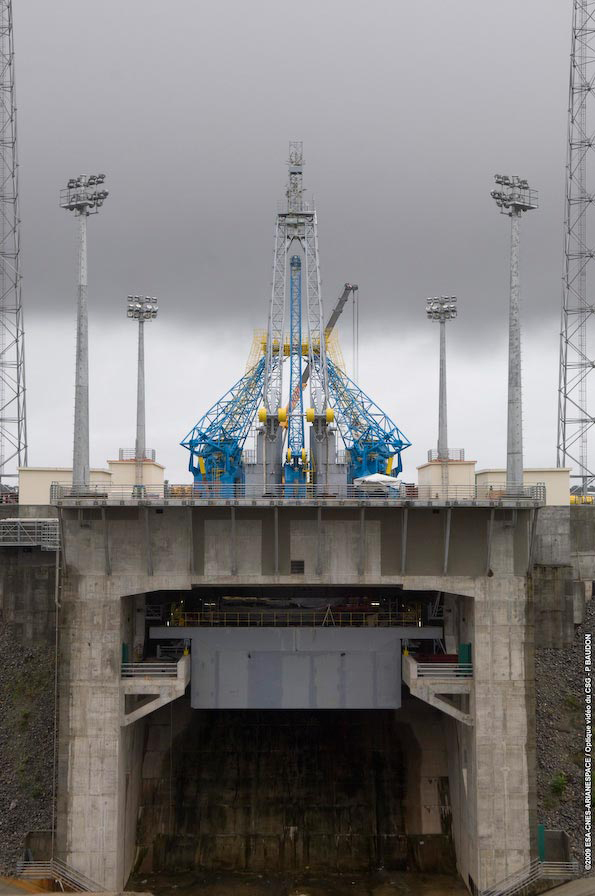 Qui vedete la stessa piattaforma a Vostochny. Si capisce molto bene che si tratta di una sorta di carroponte che può muoversi avanti ed indietro. Ovviamente nella posizione retratta (utilizzata durante il lancio) la paratia frontale va a coincidere con il bordo dello scivolo della flame trench.