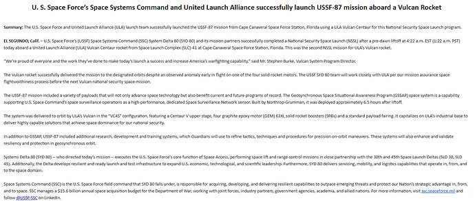 "Early during flight, the team observed a significant performance anomaly on one of the four solid rocket motors. Despite the observation, the Vulcan booster and Centaur performed nominally and delivered the spacecraft directly to geosynchronous orbit,’ said Gary Wentz, ULA vice president of Atlas and Vulcan Programs. “The integrated U.S. government and contractor team is reviewing the technical data, available imagery, and establishing a recovery team to collect any debris. We will conduct a thorough investigation, identify root cause, and implement any corrective action necessary before the next Vulcan mission.”