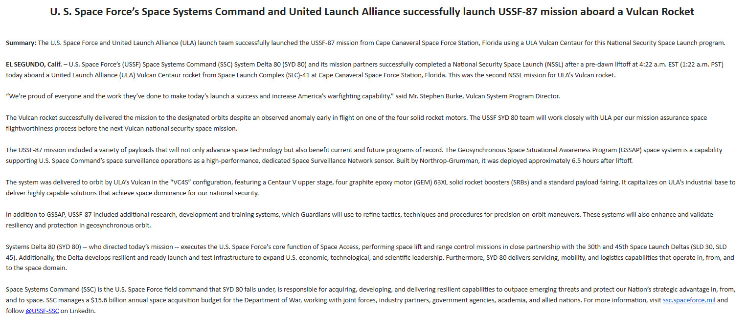 Cape Canaveral Space Force Station, Fla. (Feb. 12, 2026) -- A United Launch Alliance (ULA) Vulcan rocket carrying the USSF-87 mission for the United States Space Force’s Space Systems Command (SSC) lifts off from Space Launch Complex-41 at 4:22 a.m....