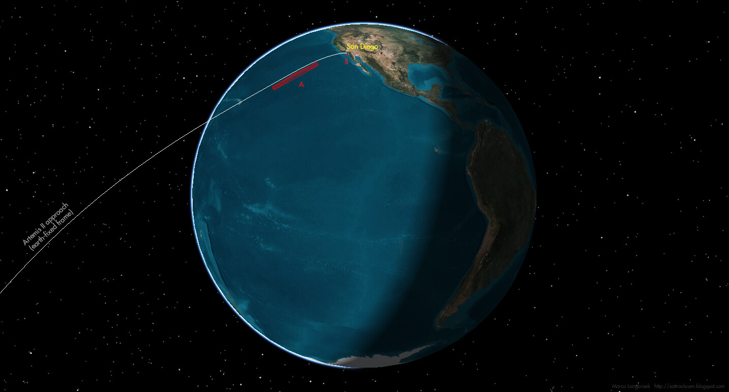 Prima Orion è un puntino lontano, la Terra gira. Il suo ground track è determinato principalmente dalla rotazione terrestre, come se fosse una stella fissa, da est verso ovest. Poi quando si avvicina alla Terra, inizia a essere predominante il moto apparente rispetto alla velocità di rotazione terrestre, quando questi due moti sono quasi uguali, si ferma sul ground track, poi quando il moto apparente è maggiore della rotazione terrestre, torna indietro, da overt a est.