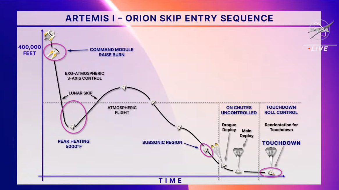 Finalmente hanno pubblicato un grafico di come sarà il rientro. A differenza di Artemis I, non ci sarà un salto sopra l’atmosfera, ma un rialzo all’interno, e molto molto meno accennato. Metto le due immagini per confronto. 200.000 piedi corrispondo a circa 60 km. Il grafico fa vedere la capsula sopra la linea di volo atmosferico. Strano che i due profili raggiungano le stesse temperature a quote molto diverse, secondo me c’è un copia e incolla, comunque non do per scontato i valori di questa slide.