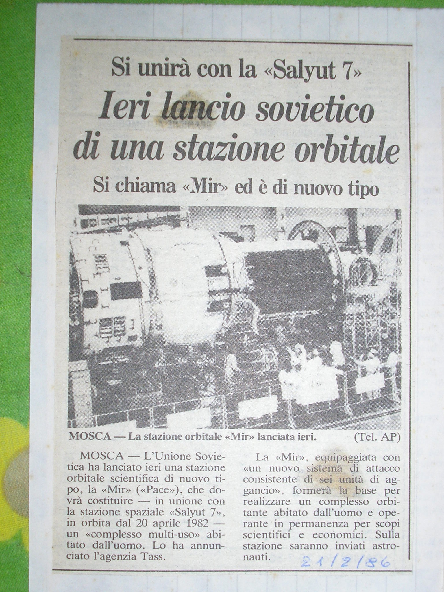 salute a tutti amici qui Lunakhod! ecco come la “gazzetta di modena” diede l’annuncio del lancio di un nuovo laboratorio orbitante in quel febbraio 1986. (dal ricco archivio giornalistico e non solo di Lunakhod). buona serata a tutti e … ciao mitica Mir, è sempre bello ricordarti!