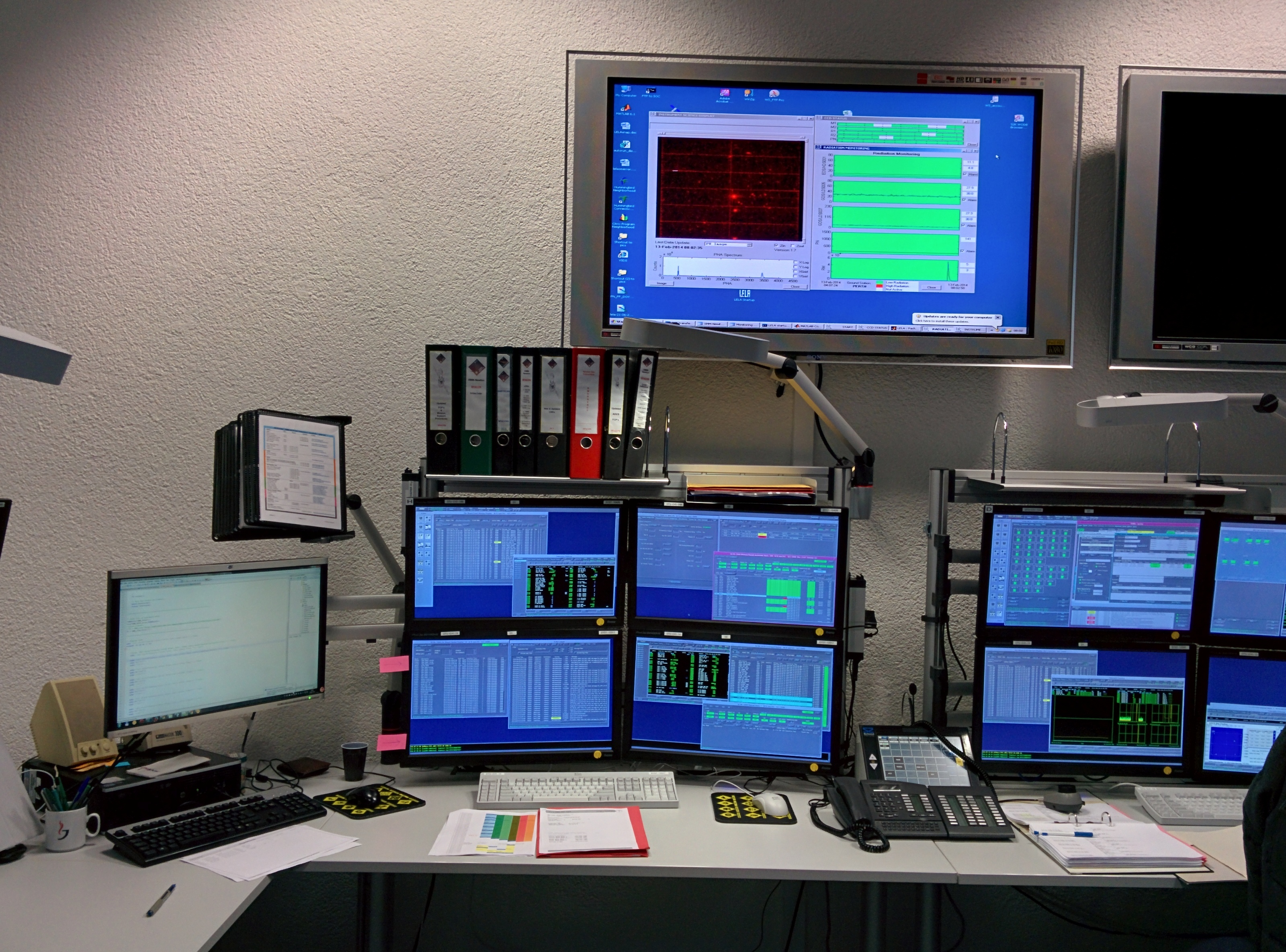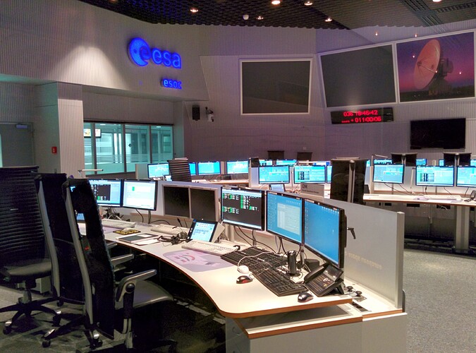 Una volta (fino a 5/6 anni fa) si avevano in dotazione consolle “all’americana”: i monitor a tubo catodico, e poi i primi TFT, erano incassati nel corpo del mobile stesso (vedi foto allegata, (C) ESA - http://www.esa.int/spaceinimages/Images/2006/02/Integral_flight_control_team_during_manoeuvres). Ora con i nuovi arredamenti si è perduto, secondo molti, un pò dell’atmosfera originale… (vedi foto (C) mestesso)
