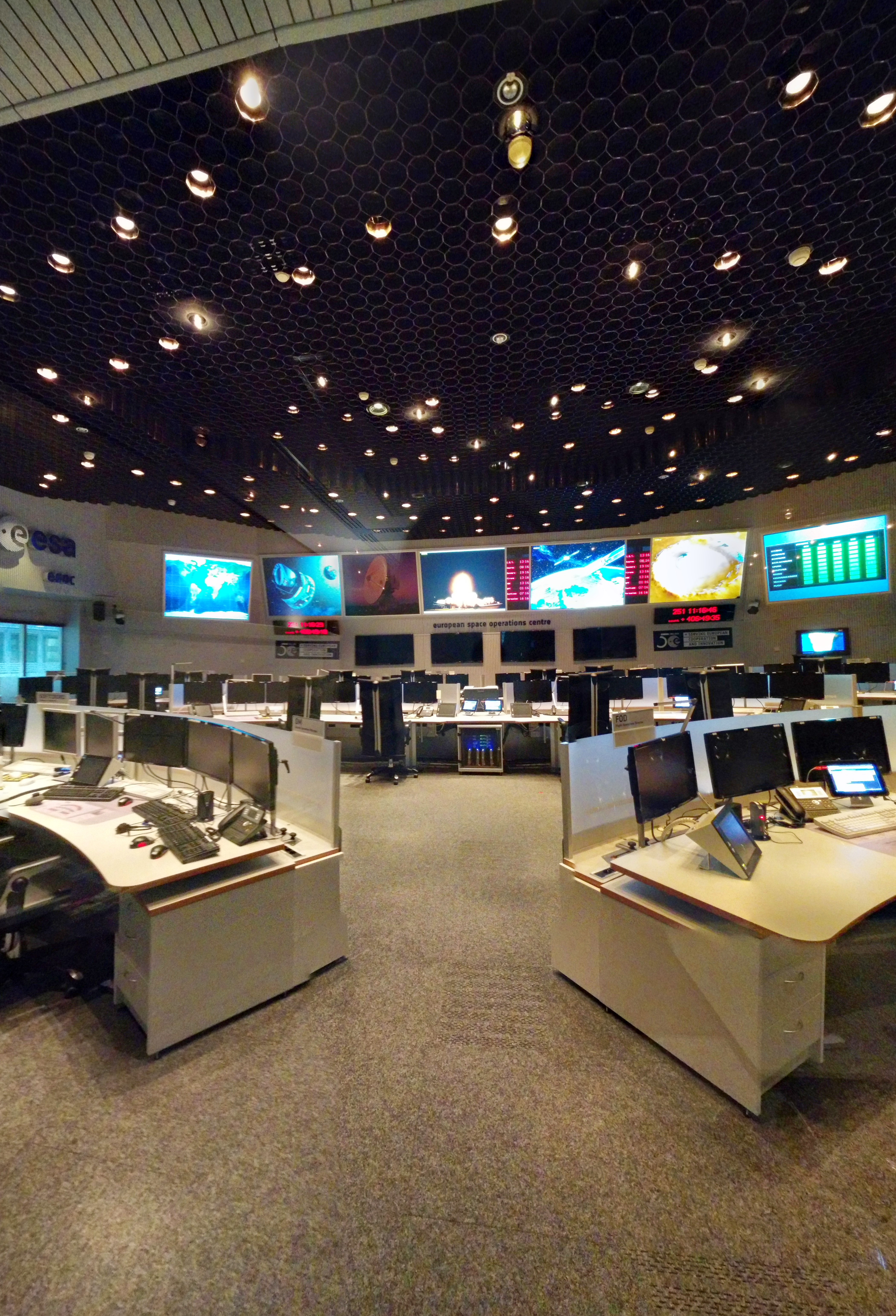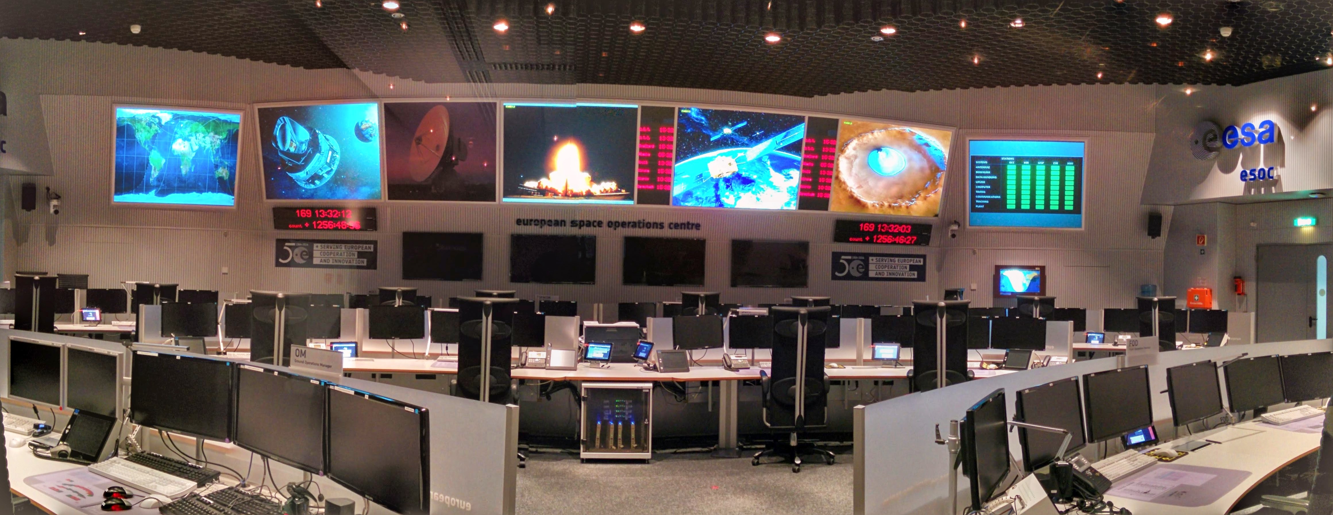 Noto che anche in ESOC le console hanno le scrivanie “curve”. È lo stesso qui da noi, e io lo trovo insopportabile: ogni volta che voglio guardare qualcuno negli occhi mentre gli parlo mi devo alzare anche se sta di fianco a me