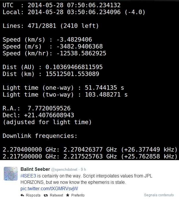 “Siamo in grado di contattare ISEE-3 da venerdì. Tutto l’hardware è pronto ad Arecibo ed è stato testato end-to-end. Stiamo aspettando l’autorizzazione a procedere da NASA. Il primo contatto porebbe avvenire quasi immediatamente iniziando al più presto martedì pomeriggio.”