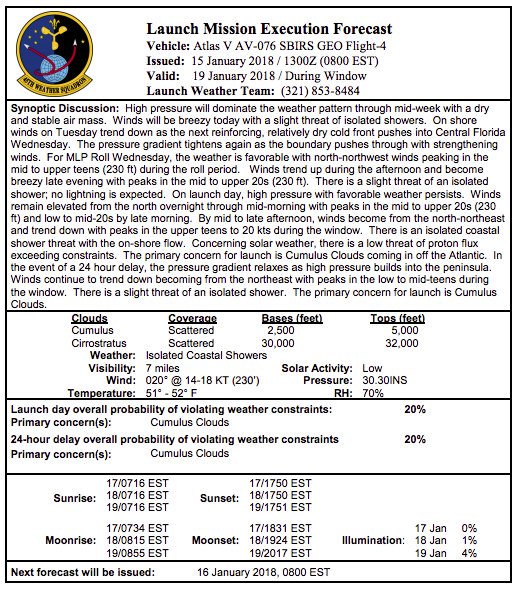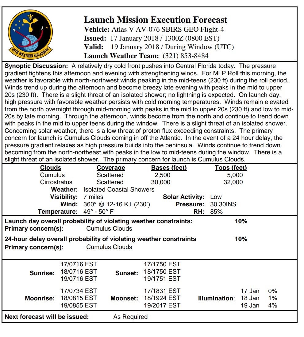 E’ al momento programmato per venerdì 19 gennaio, con finestra di 40 minuti che si aprirà alle 1.52 ora italiana (sul posto saranno le 19.52 del 18/01), il lancio di SBIRS GEO Flight 4, mediante un Atlas V in configurazione 411 (ossia con payload da 4 metri e un booster laterale).
