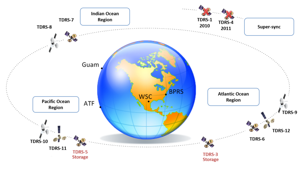 La loro collocazione si può dedurre da questo disegno. L’ orbita supersincrona di TDRS 1 e 4 è un’orbita-cimitero. TDRS-B non è mai arrivato in orbita, perché, come si può intuire dalla data di lancio, era nella stiva del Challenger al momento del suo fatale volo.
