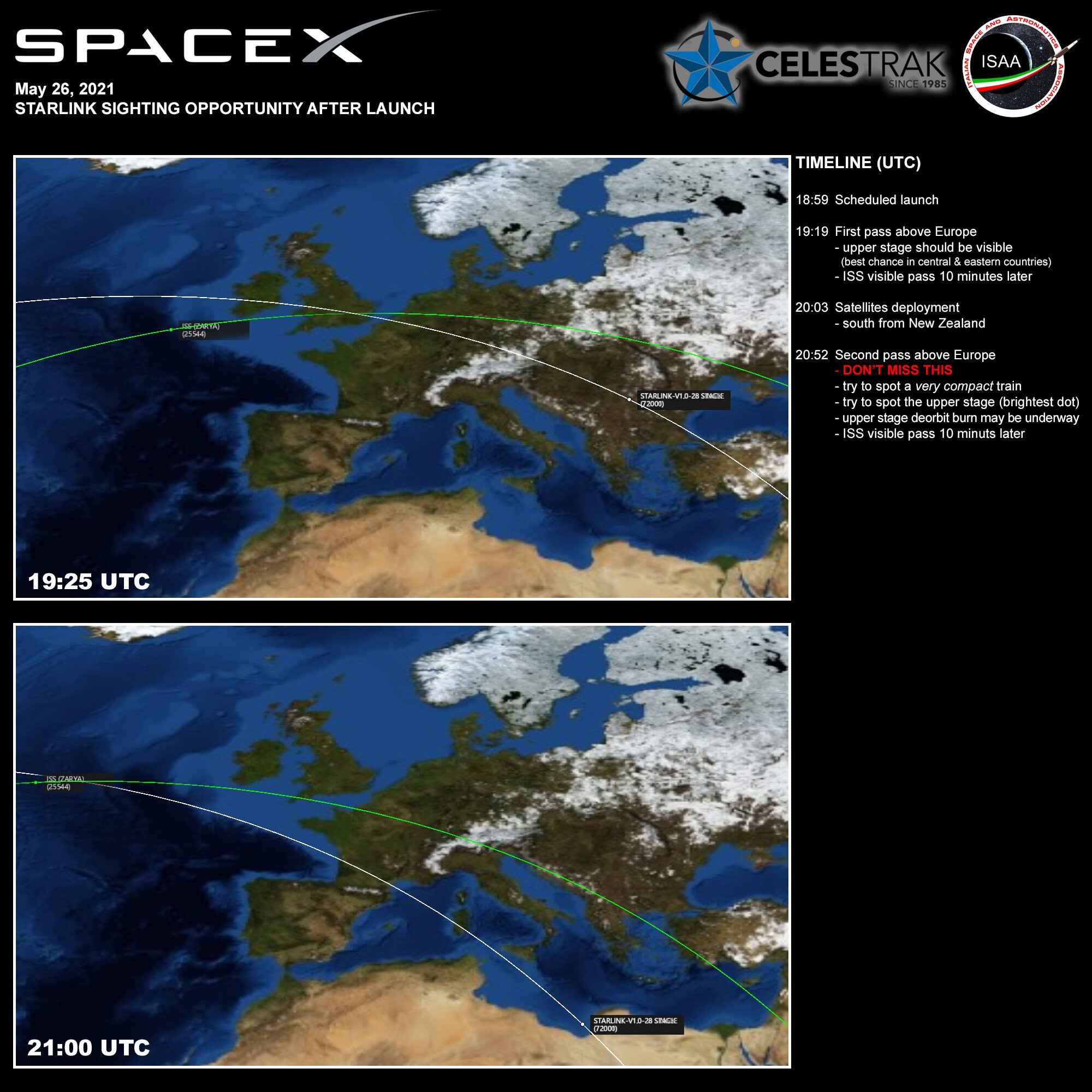 Come da immagine, l’accensione del secondo stadio di Starlink-28 è nel passaggio delle 22:52 CEST.