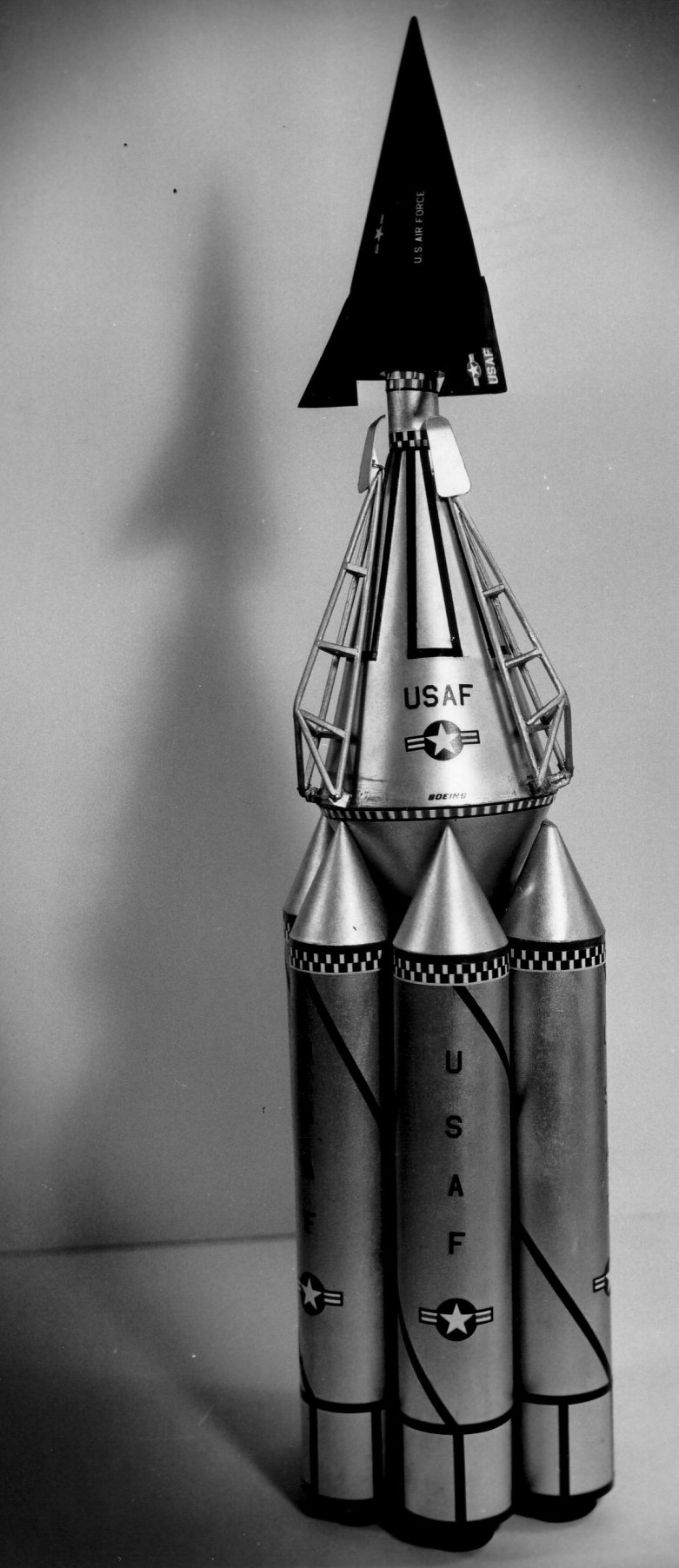 Per quanto riguarda il “cluster” di missili Titan (I o II??) l’unico prcedente che mi viene in mente era quello relativo alla versione orbitale del North-American X-15 (lo X-15B) che, in una delle varie elaborazioni, doveva essere messo in orbita da un cluster di 4 Titan I, in cui 3 fungevano da “boosters” ed 1 da “sustainer”.